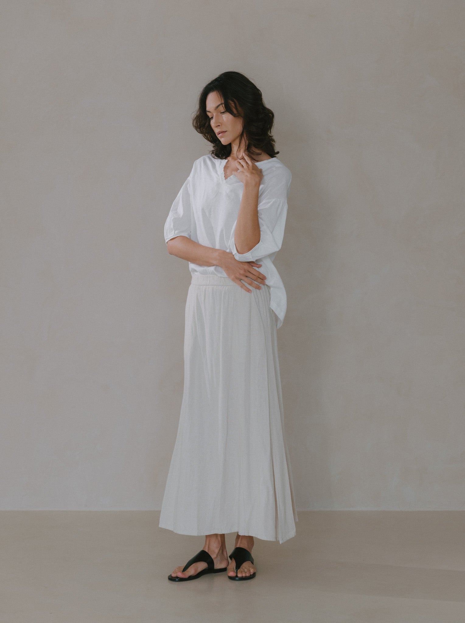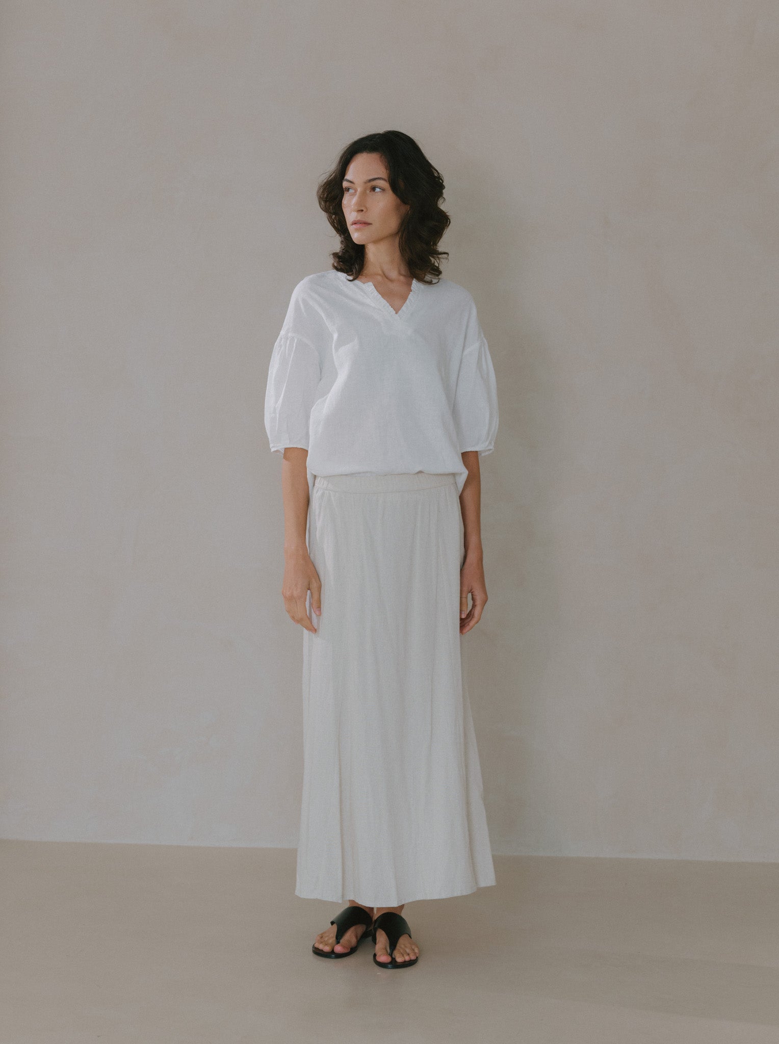 Softly structured and effortlessly charming, this ruffle neck top brings a refined texture to light layering. Made from a breathable blend of ramie and cotton, it features voluminous half sleeves and a relaxed silhouette, elevated by a delicate ruffle trim at the neckline. A timeless piece that balances comfort and subtle detail with ease.
