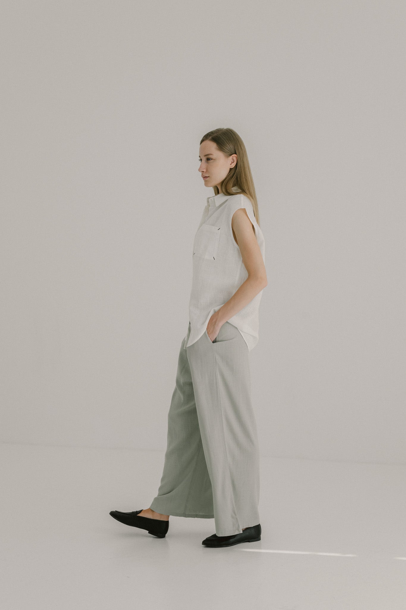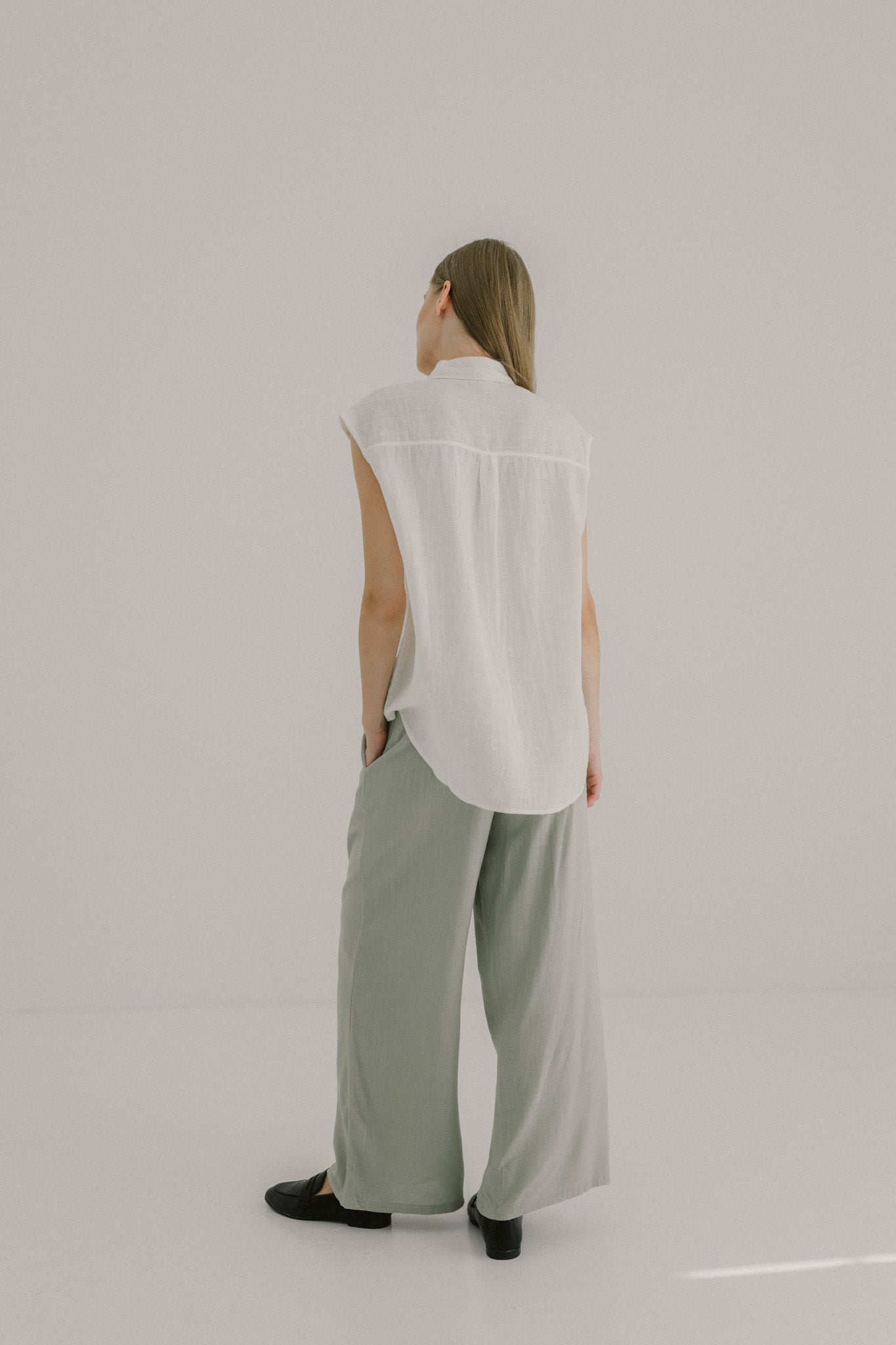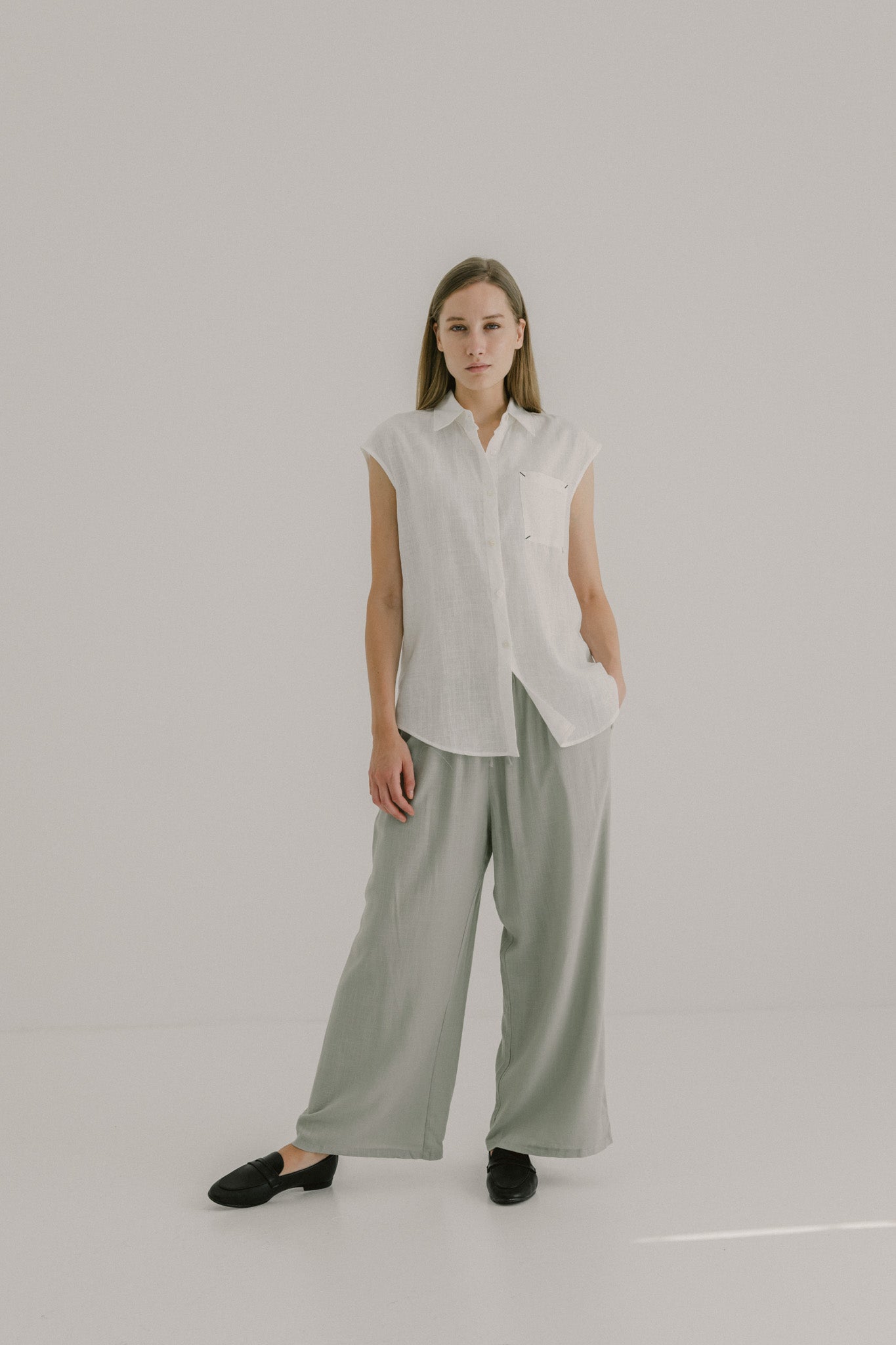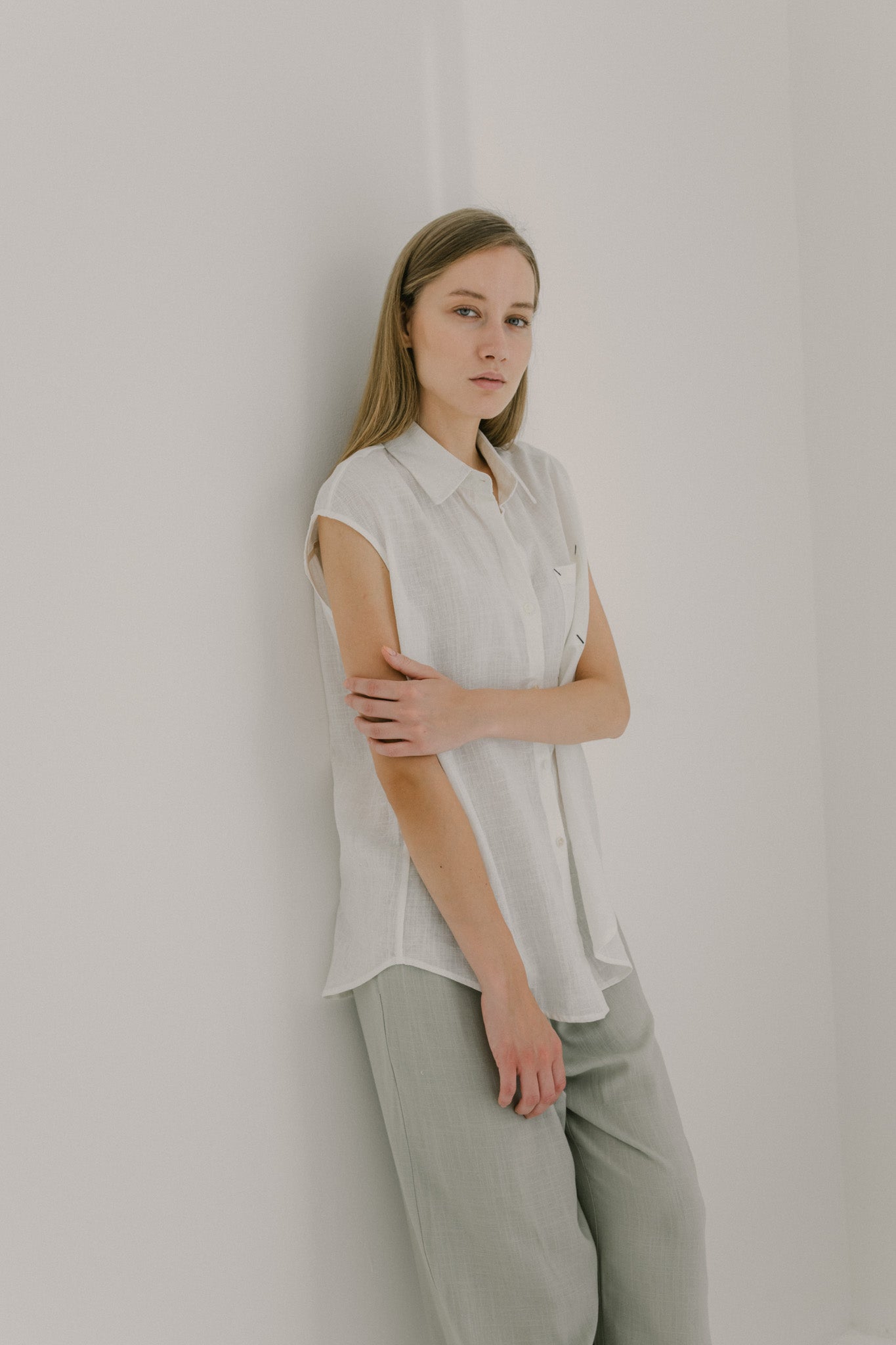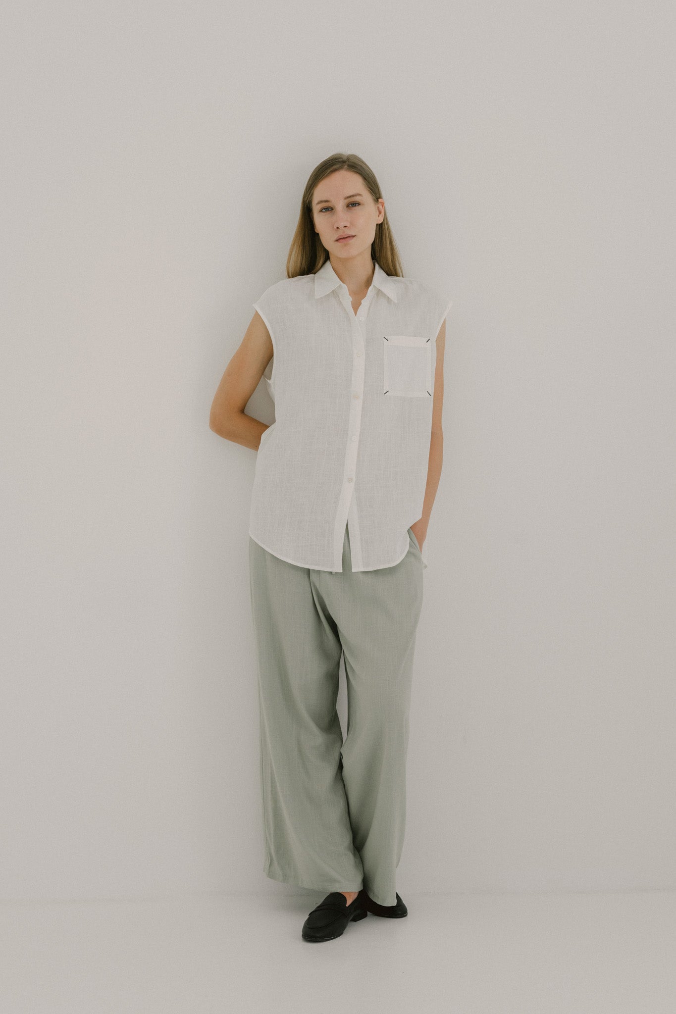 Effortless and breathable, this sleeveless linen shirt is designed with a relaxed fit that drapes naturally against the body. Featuring a classic pointed collar, button-down front, and a front pocket with subtle contrast stitching, it balances clean lines with a touch of detail. Finished with a curved hemline, it layers easily over trousers or skirts for a look that feels both refined and easygoing.