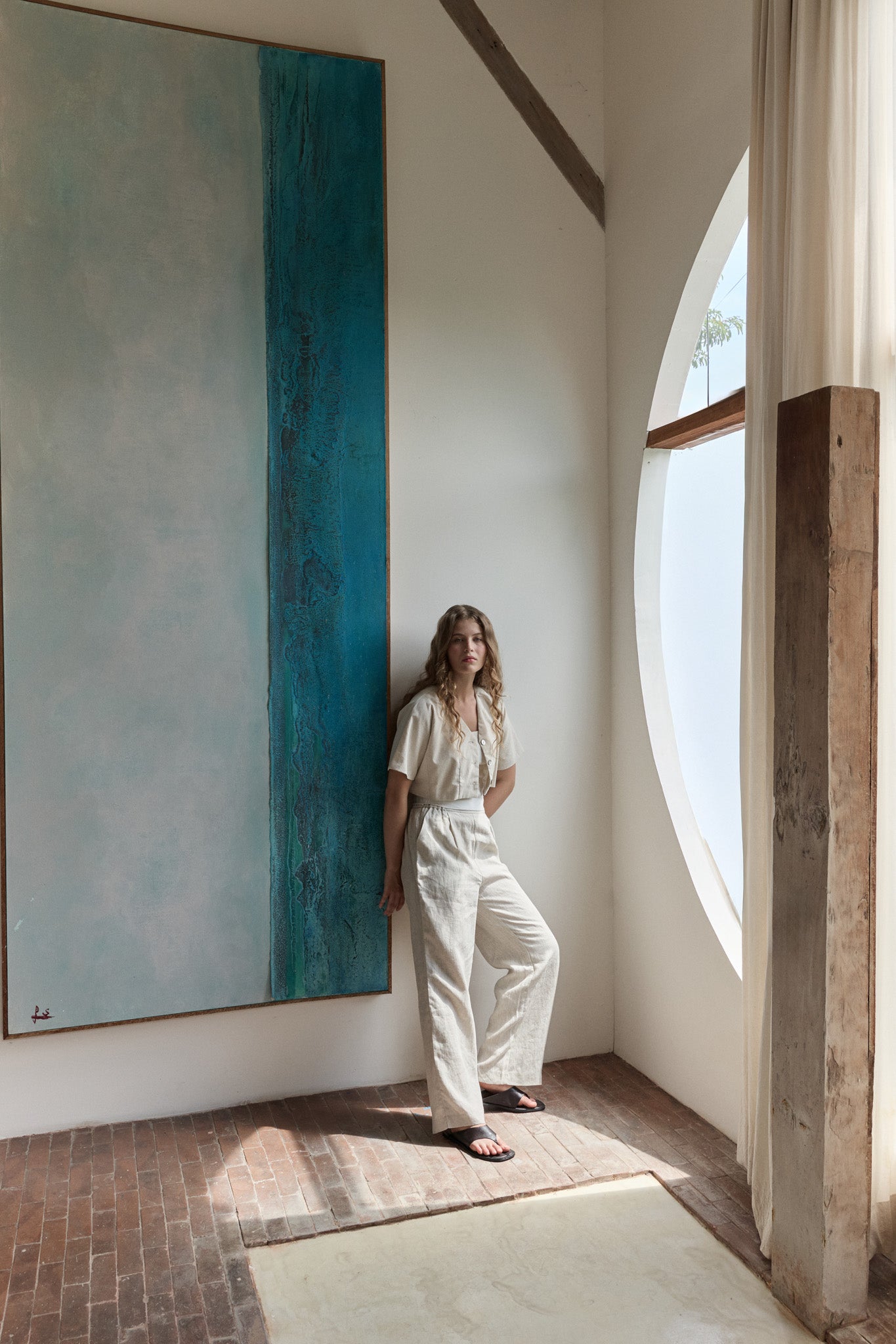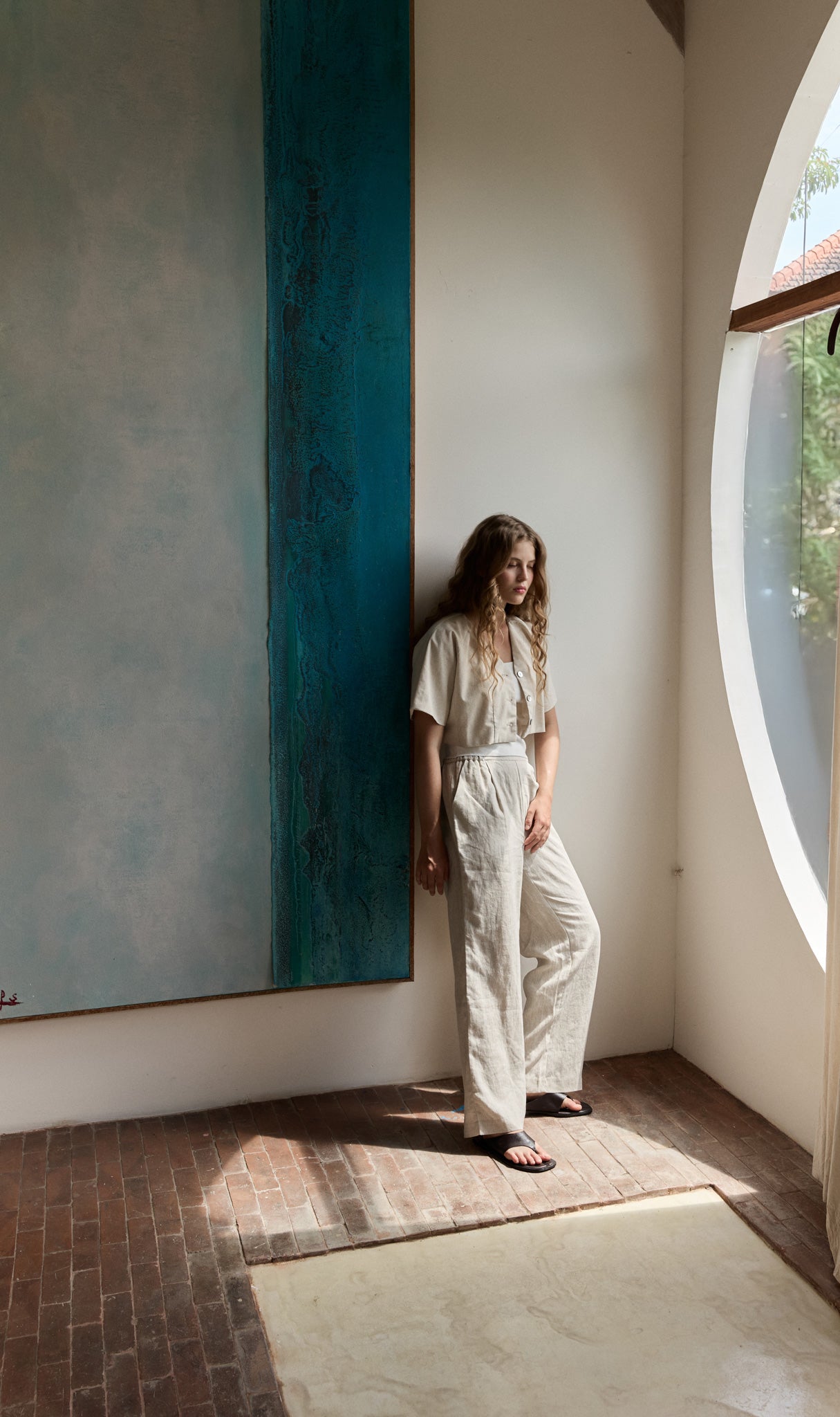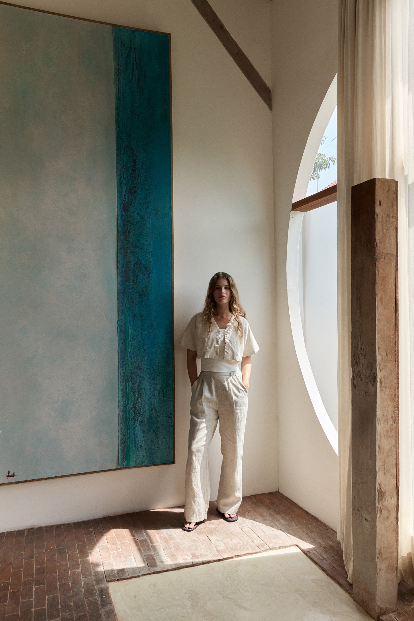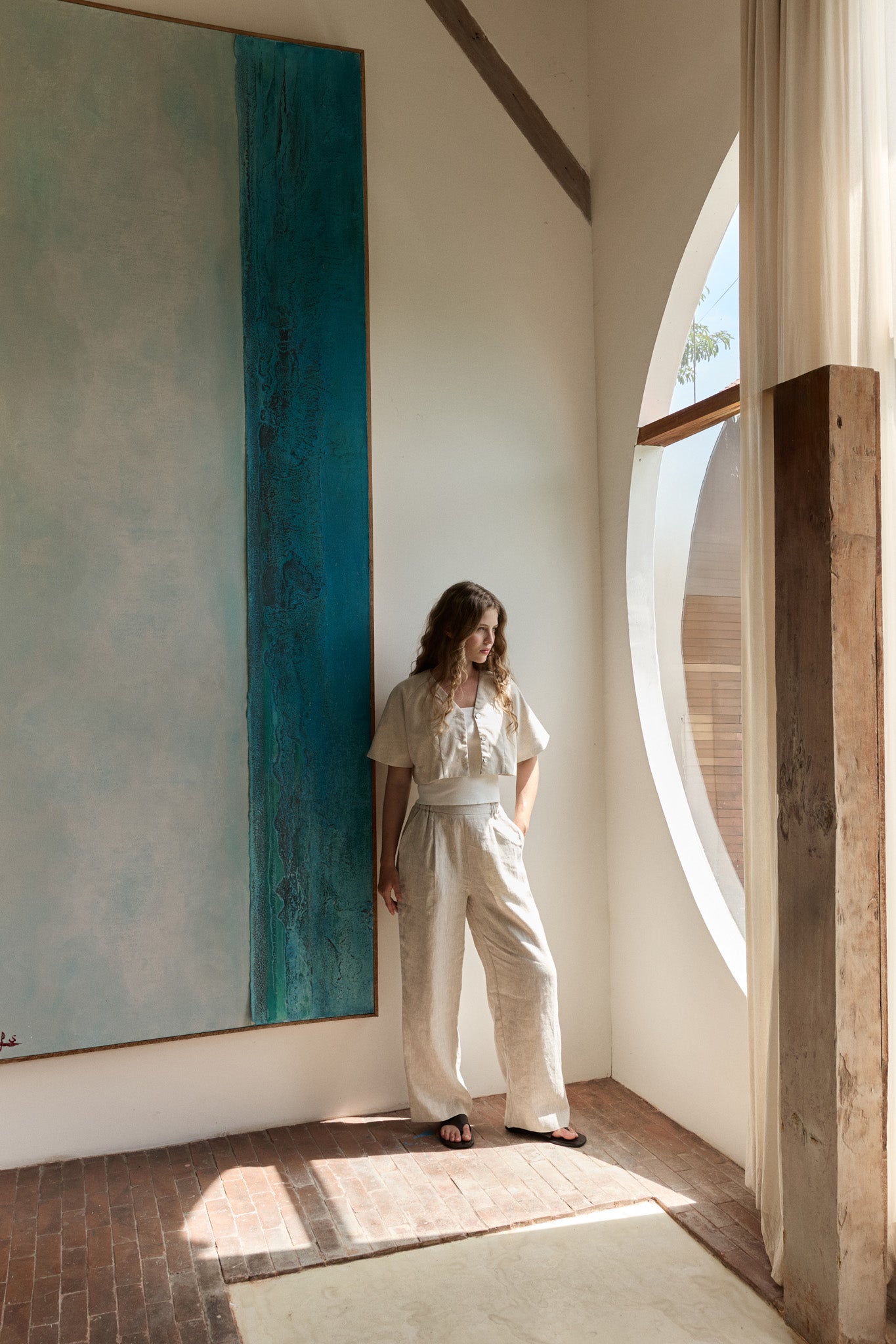 Light and breathable with a soft drape, these flare trousers offer ease in every step. Designed with pleated fronts, a relaxed leg, and side pockets for everyday function - they bring comfort and movement to bright, open spaces.