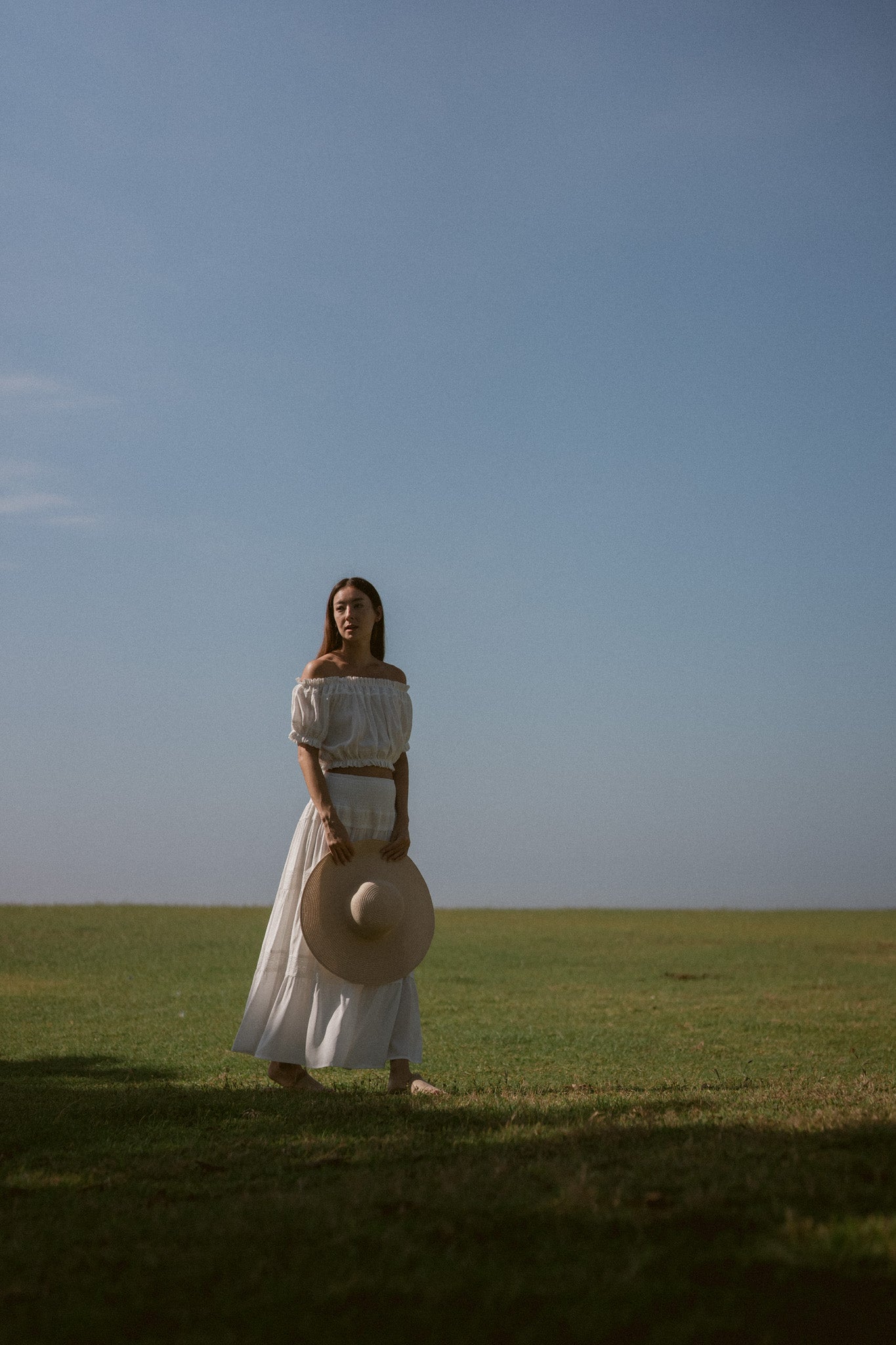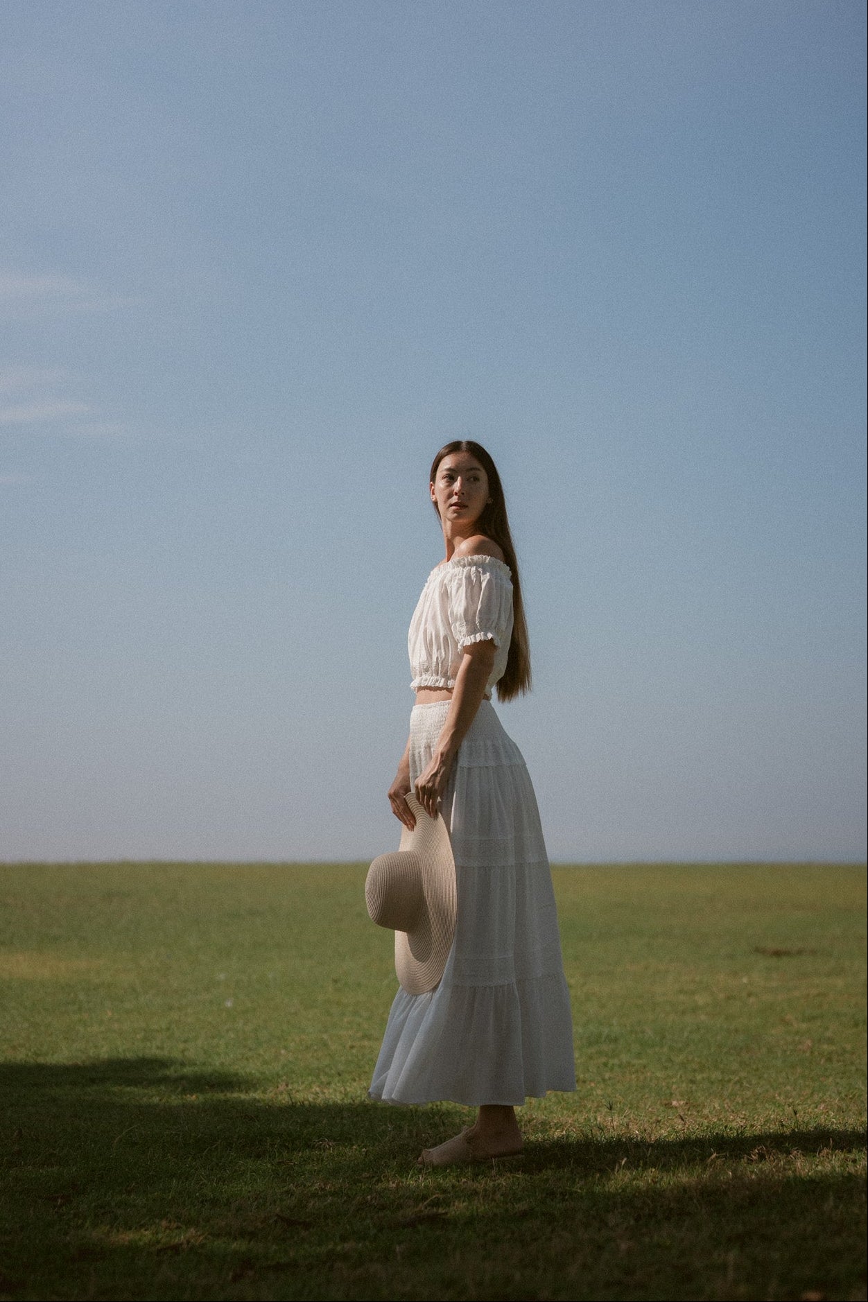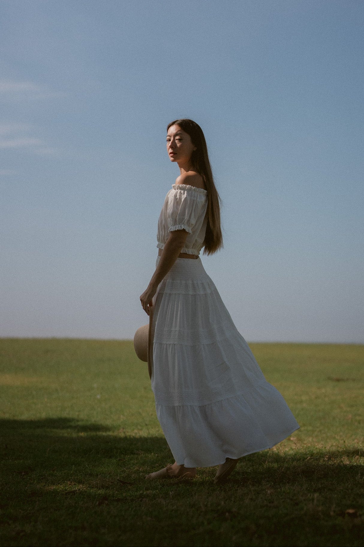 Soft light, open sky - the Aoi Layer Skirt moves like a quiet breeze over the fields. Designed with tiered layers that fall gently to the ankle, it drifts with every step, capturing the ease of summer days and the stillness of horizon air.