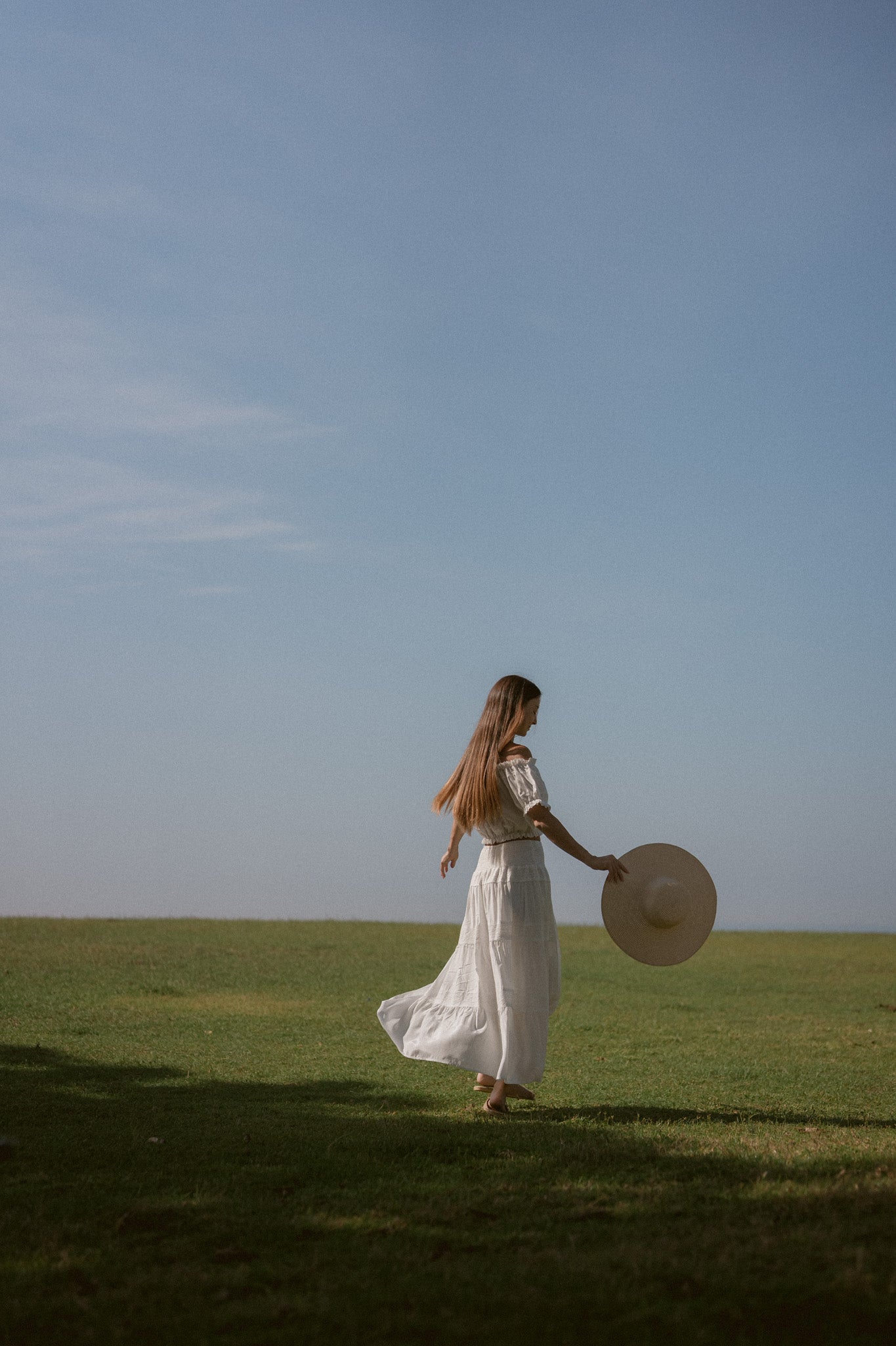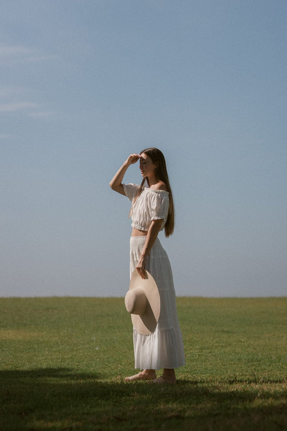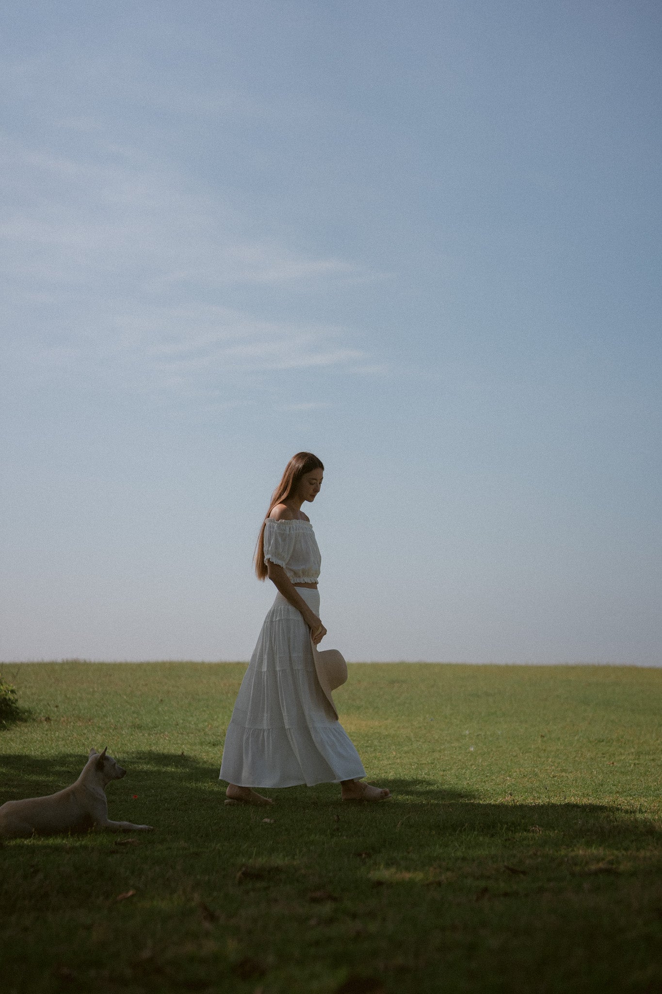 Soft light, open sky - the Aoi Layer Skirt moves like a quiet breeze over the fields. Designed with tiered layers that fall gently to the ankle, it drifts with every step, capturing the ease of summer days and the stillness of horizon air.