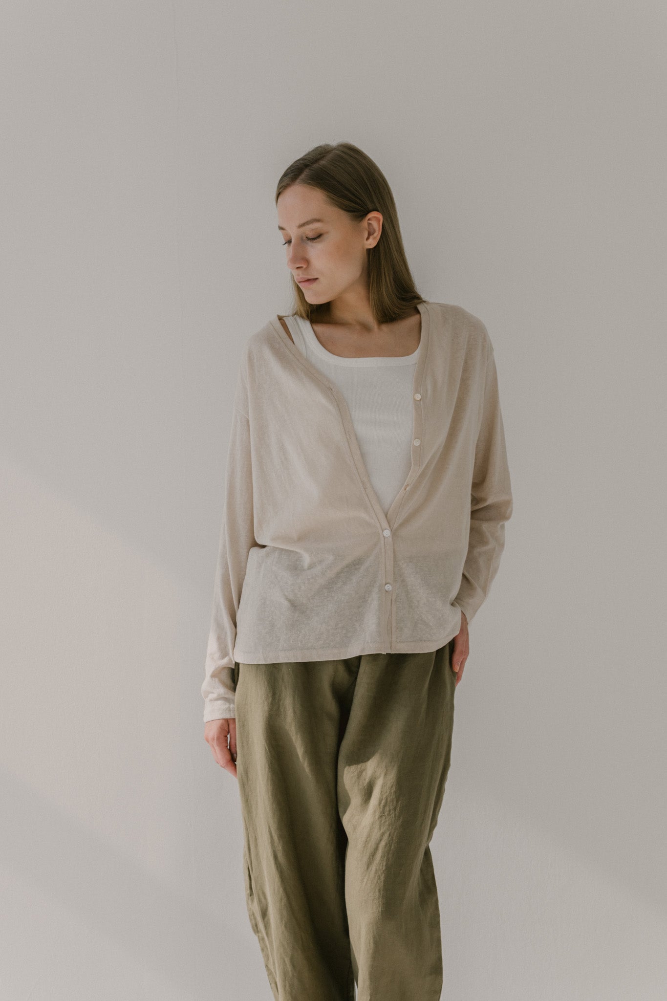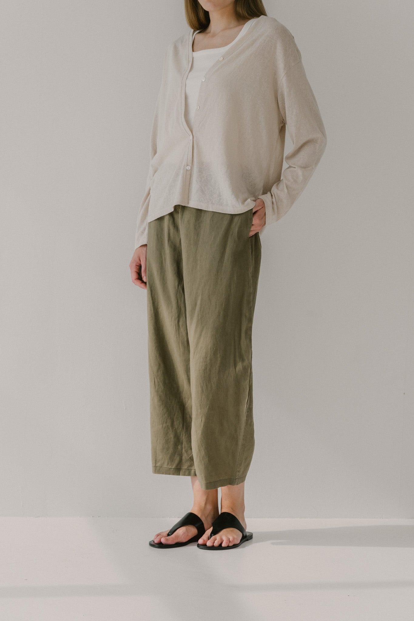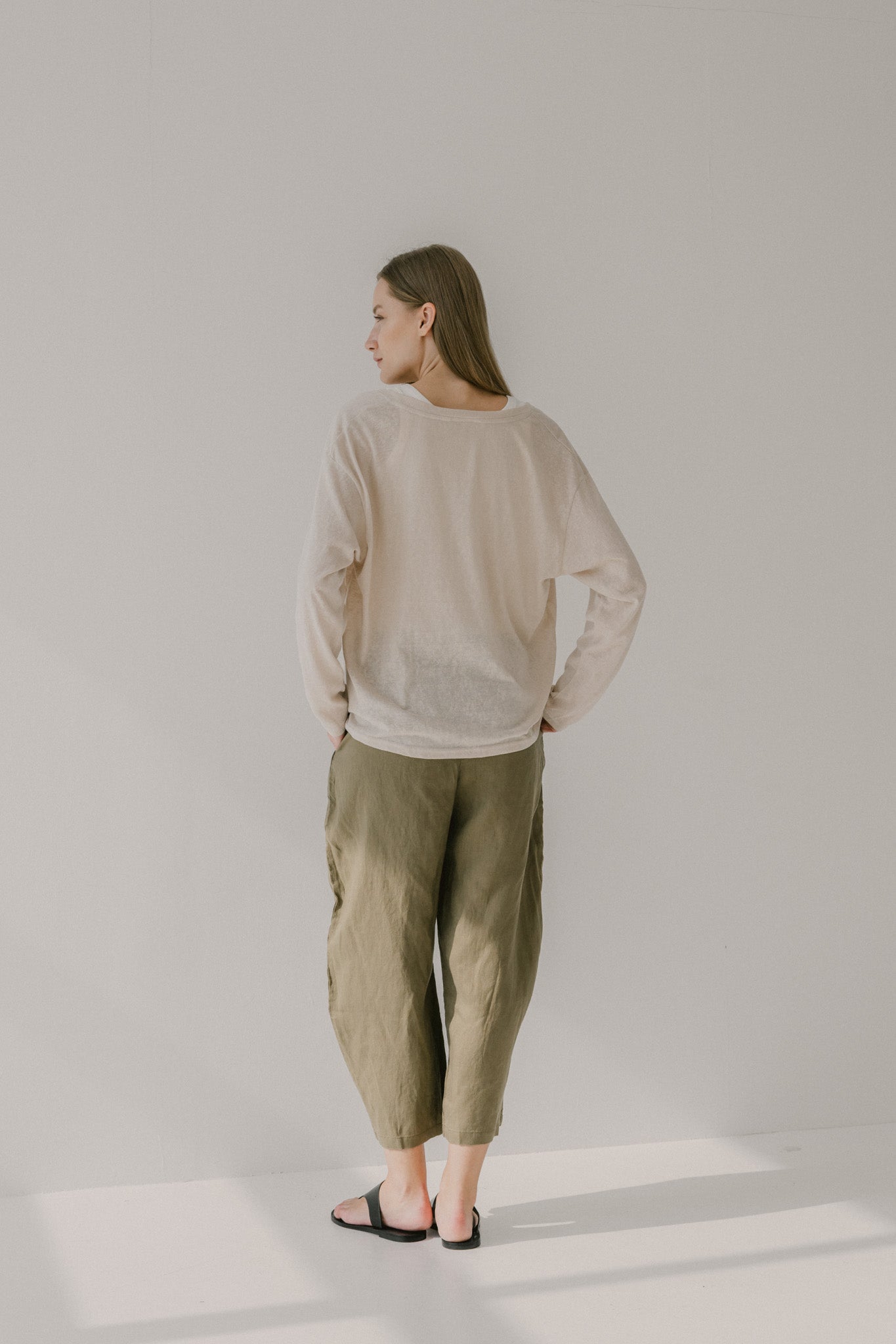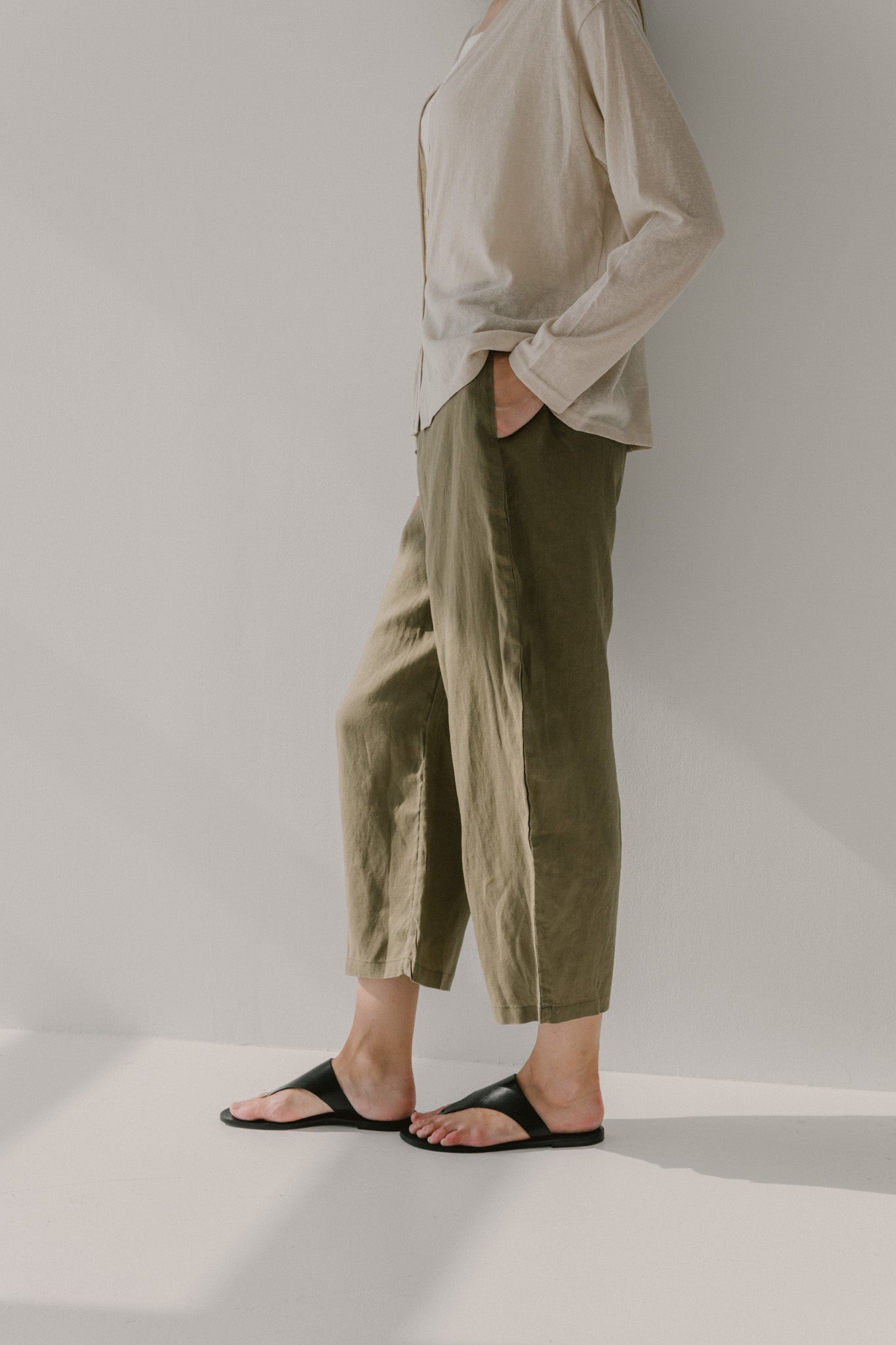 Shaped with a gentle curve, these trousers bring ease and quiet structure all at once. The barrel-leg cut offers a relaxed silhouette that feels effortless, while the natural texture of linen keeps it light and breathable. A piece that carries you with ease through slow mornings, city errands, or evenings at home.