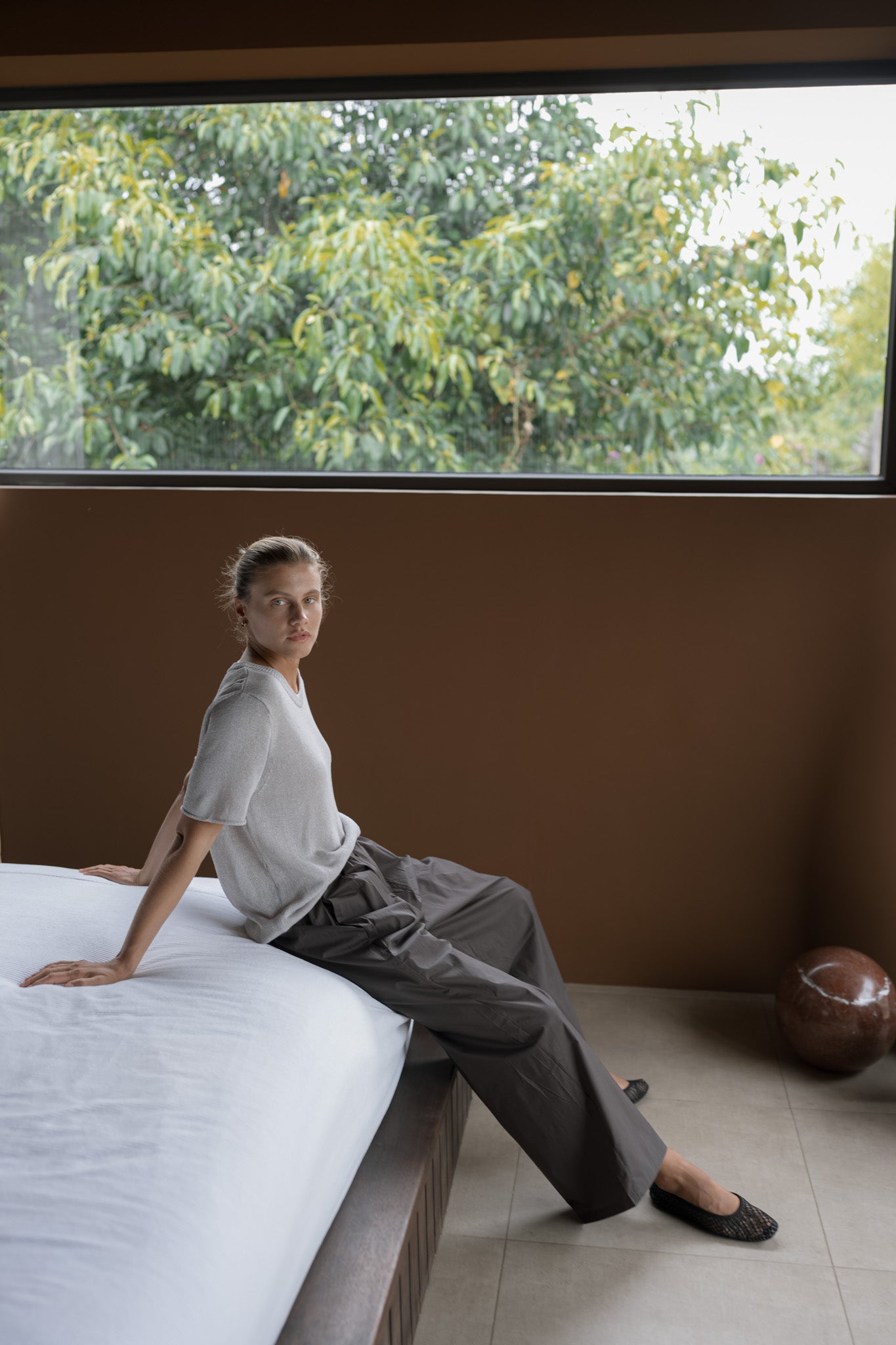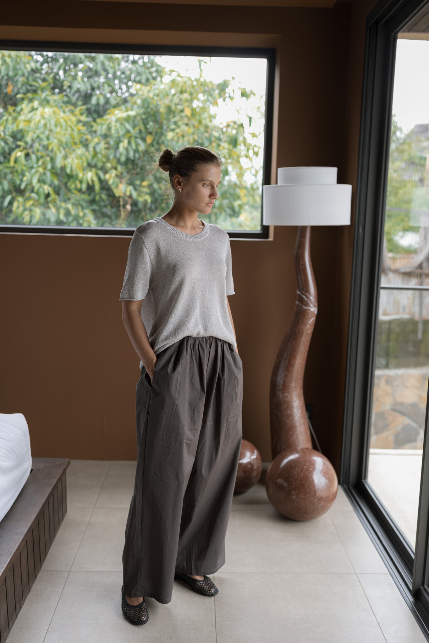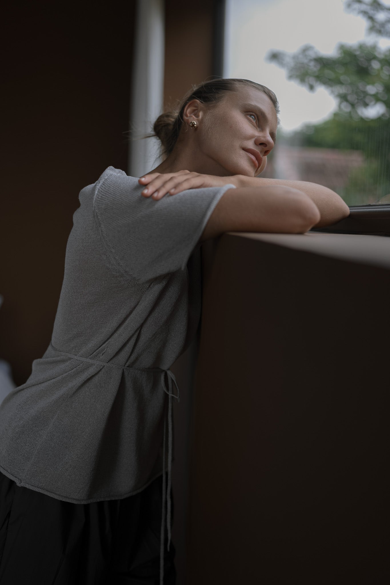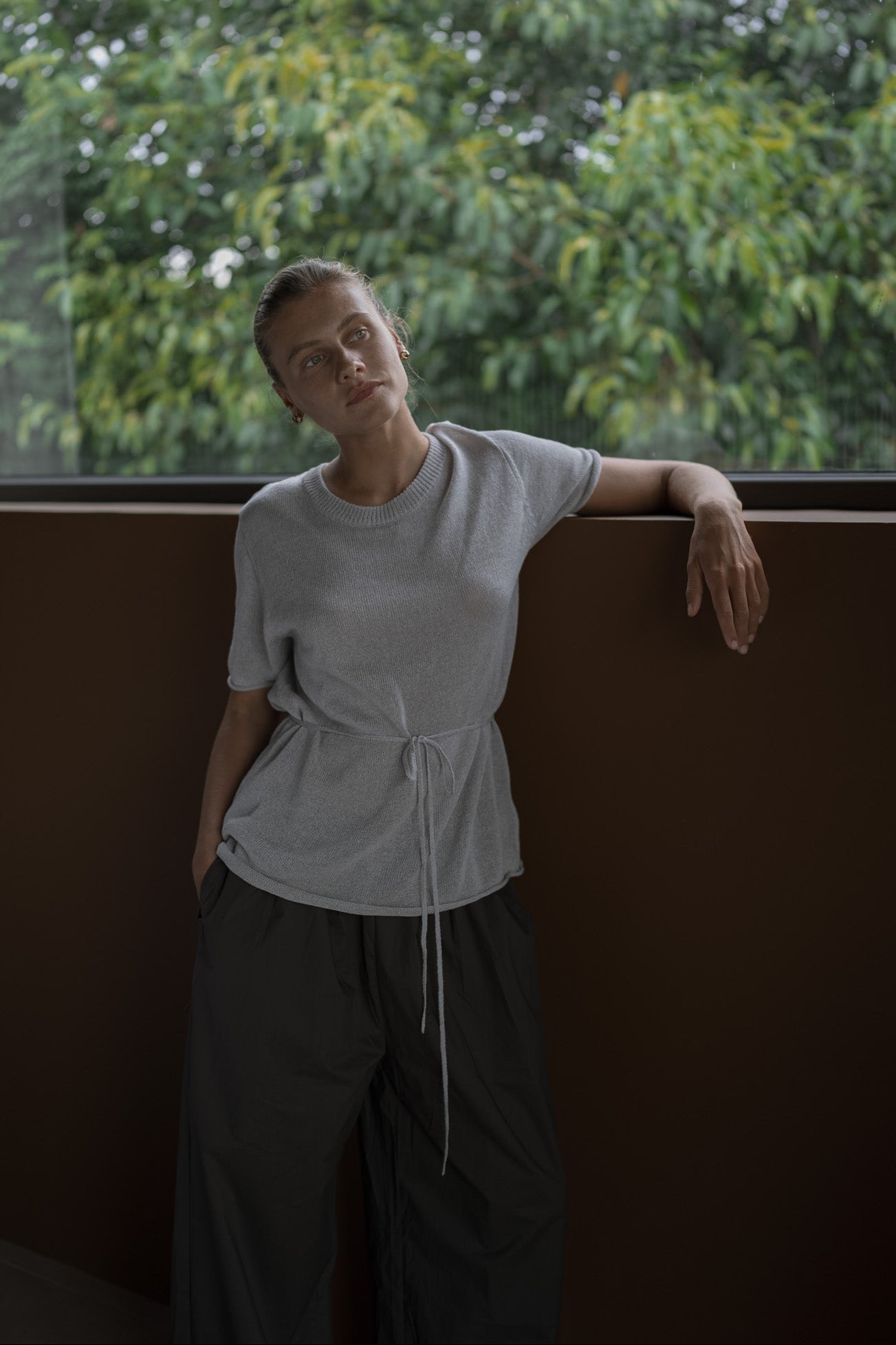 Knitted with a soft, semi-sheer texture, it drapes naturally over the body while the adjustable waist tie creates gentle definition. The round neckline and short sleeves keep the silhouette clean and versatile.