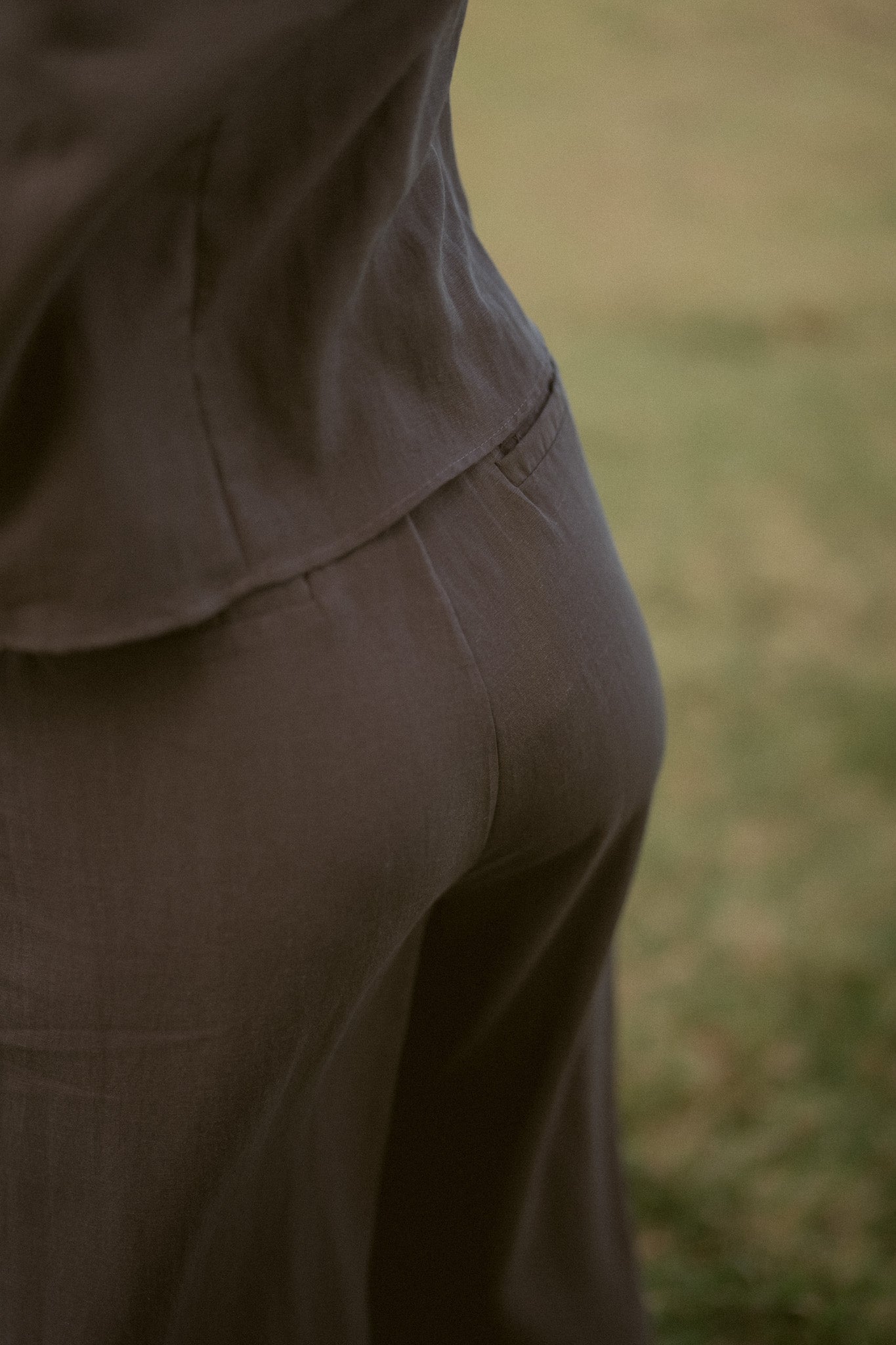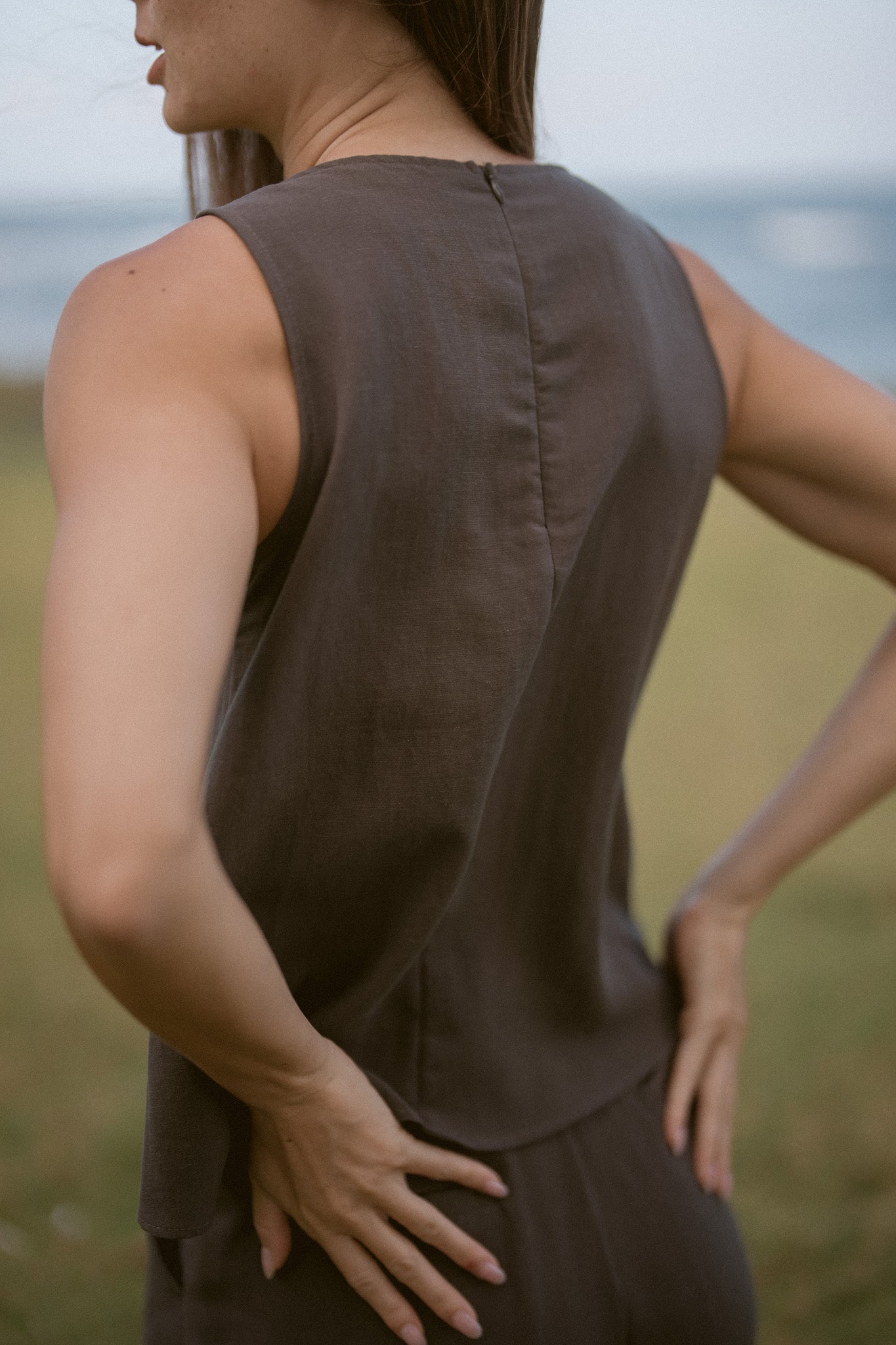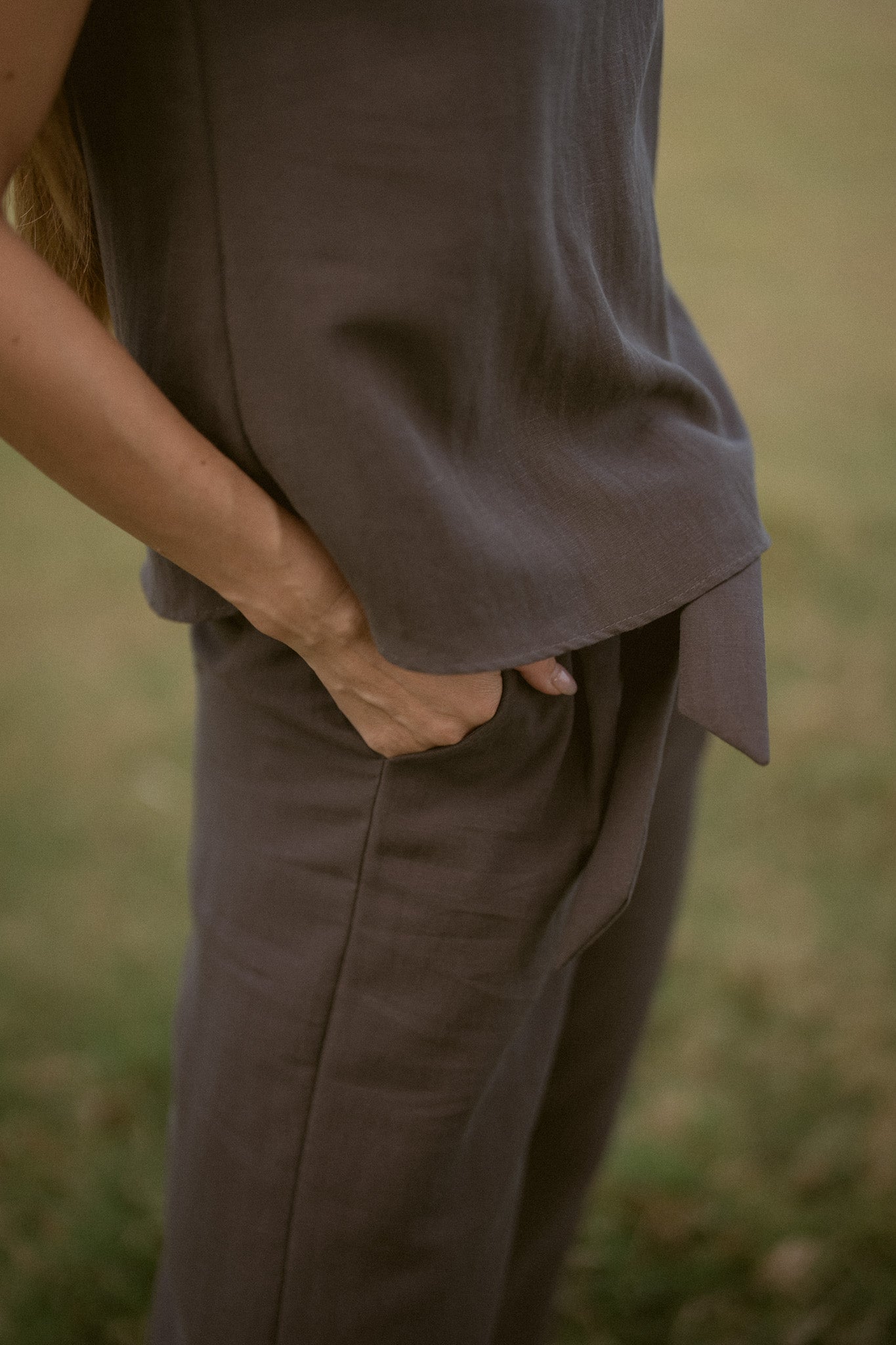 Soft as the sea breeze and fluid like the horizon, this set moves with quiet ease. The sleeveless top drapes gently over the body, meeting wide, flowing trousers that gather at the waist — a silhouette of calm and grace.