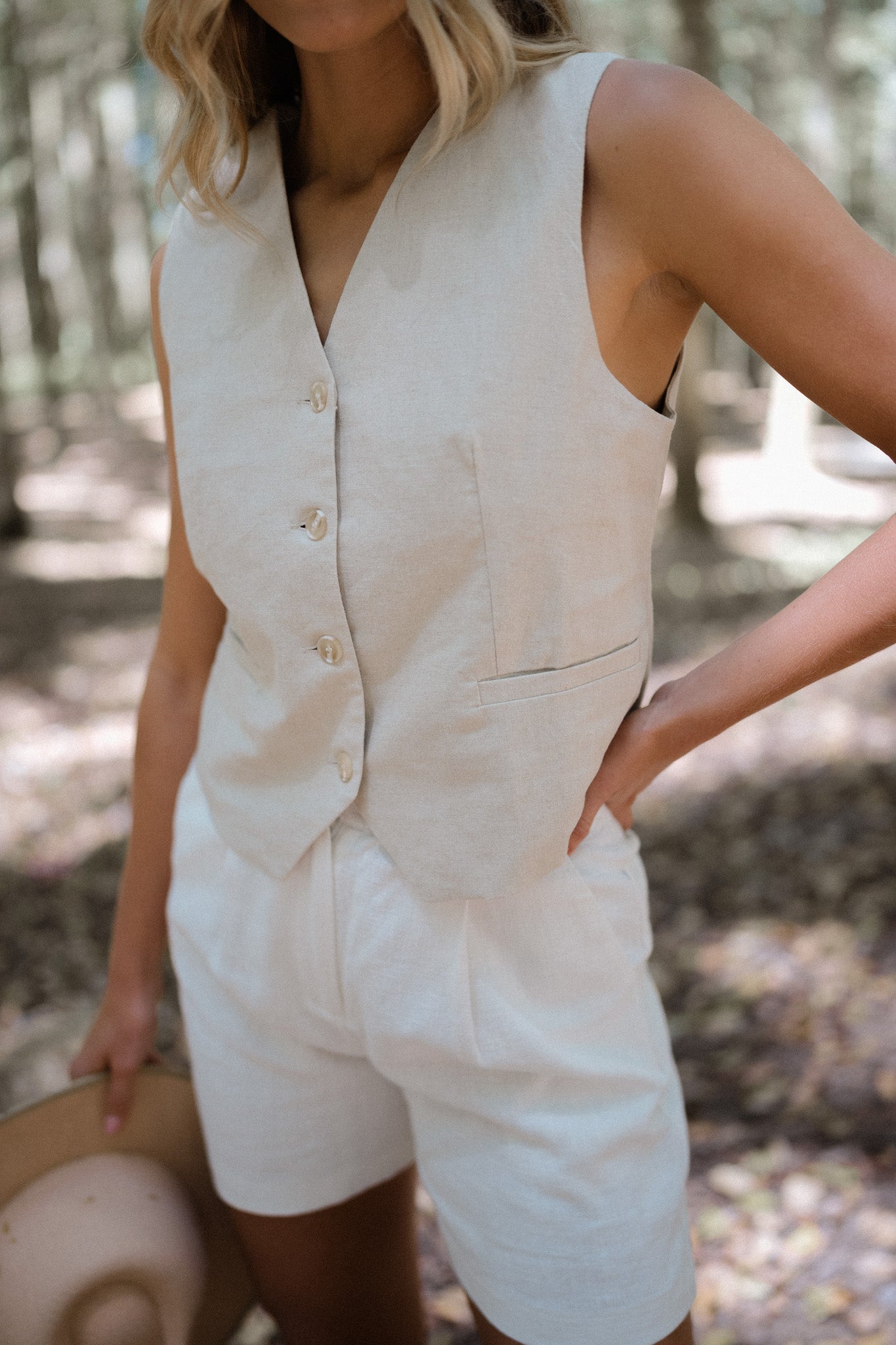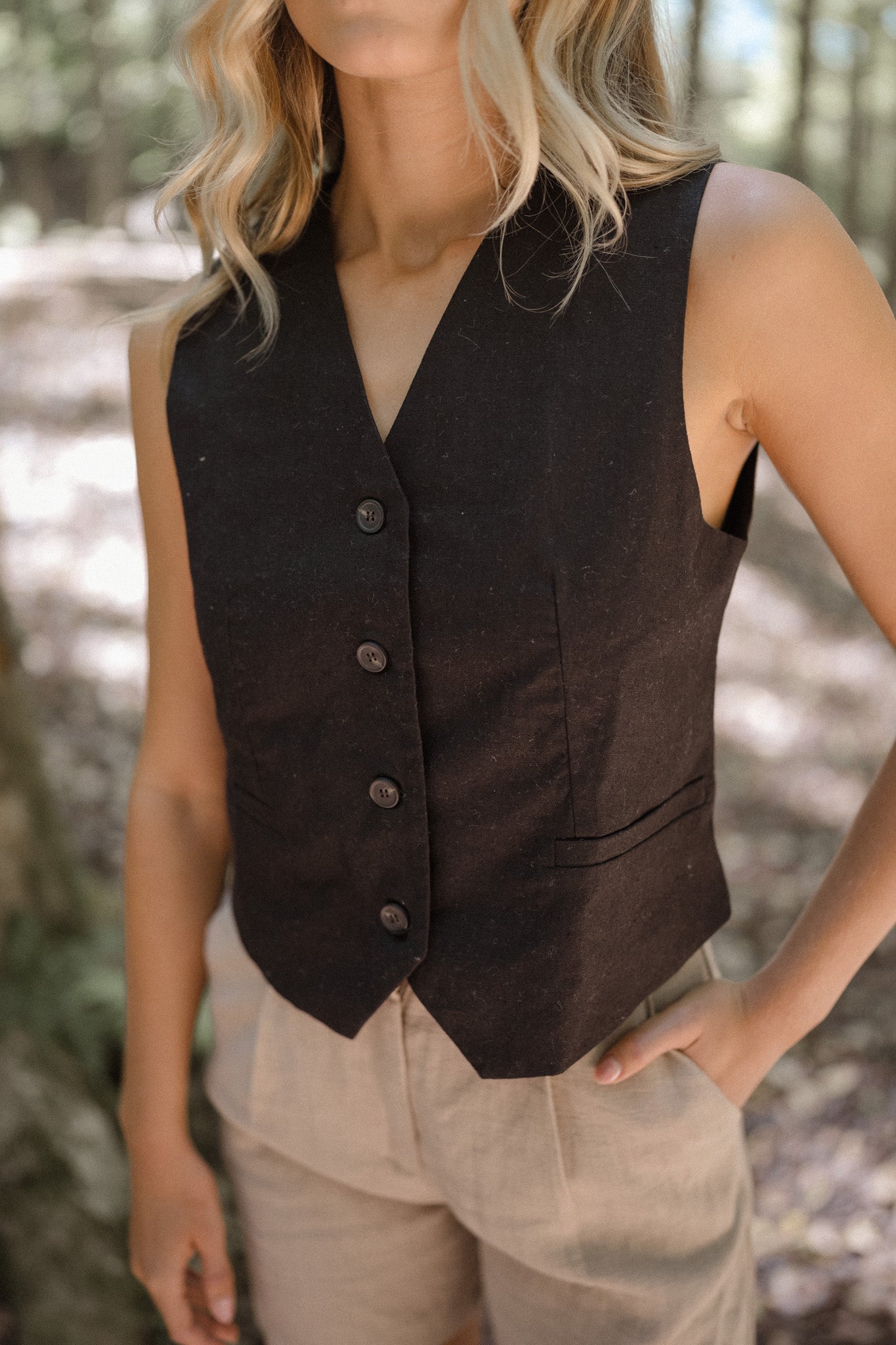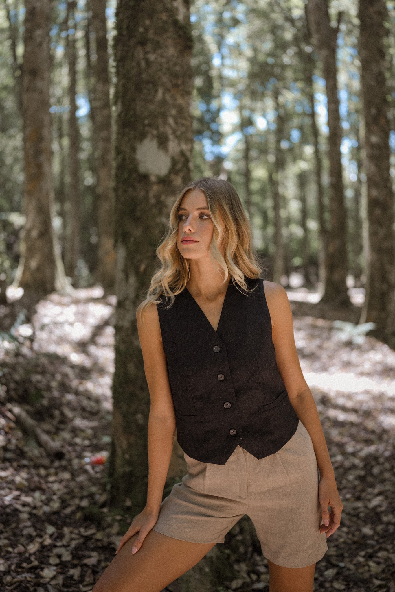 This linen vest is a versatile and timeless wardrobe staple, perfect for adding a touch of sophistication to any outfit. This linen vest effortlessly bridges the gap between smart and casual styles. Its natural texture and slightly wrinkled finish lend it a relaxed charm, while its tailored silhouette ensures a refined appearance. Available in neutral tones or natural and black, this linen vest is a chic addition to any seasonless wardrobe.