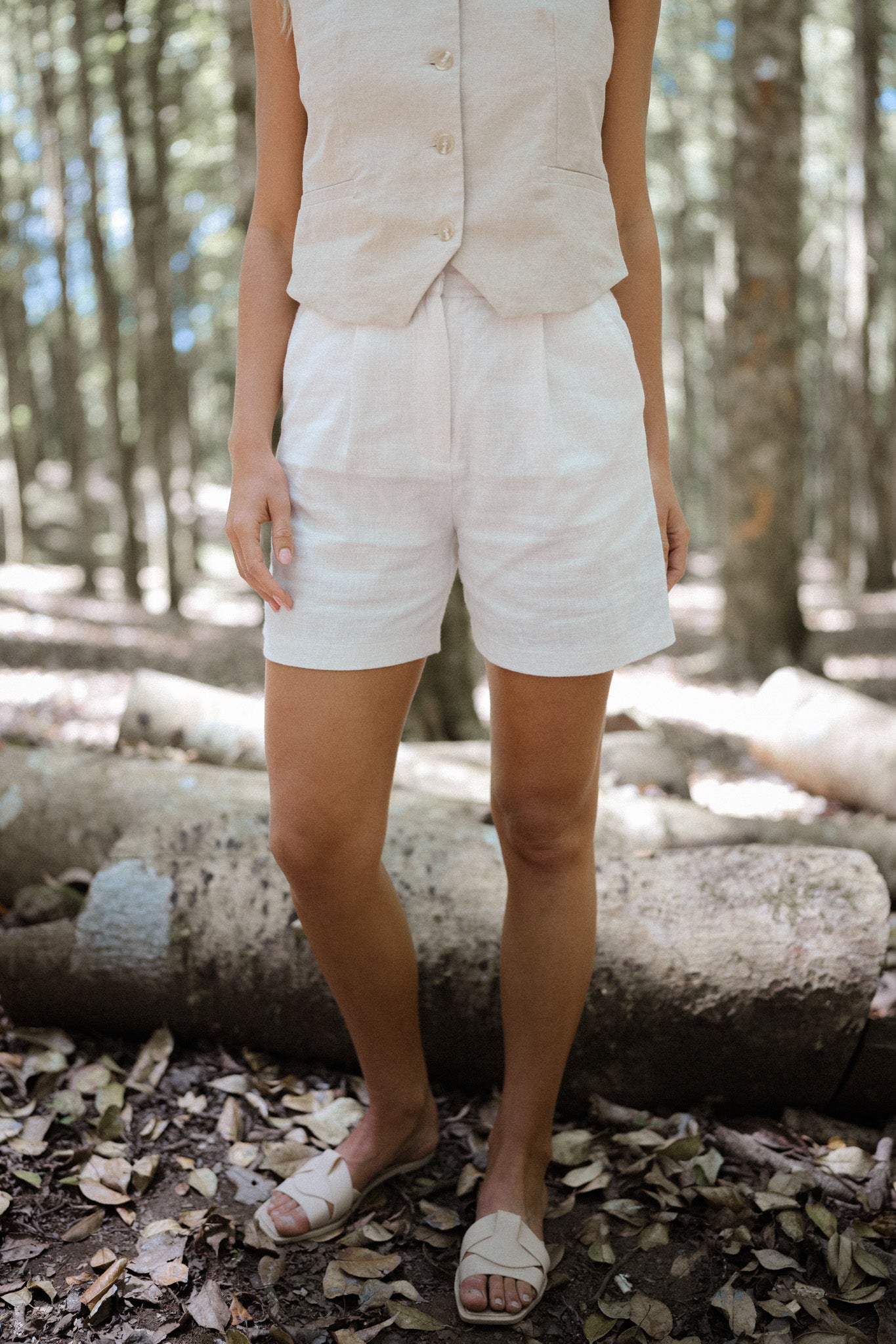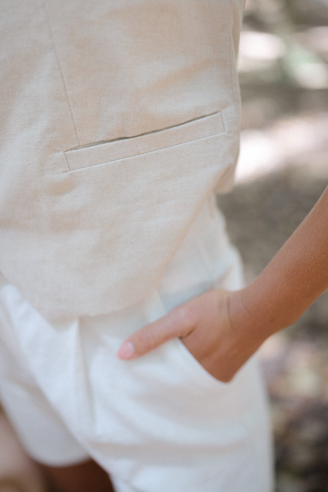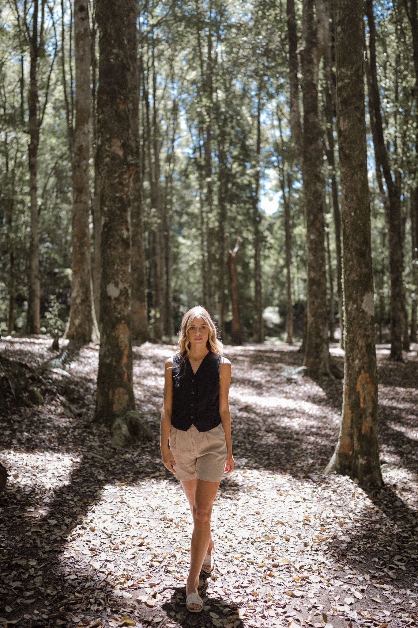 This linen vest is a versatile and timeless wardrobe staple, perfect for adding a touch of sophistication to any outfit. This linen vest effortlessly bridges the gap between smart and casual styles. Its natural texture and slightly wrinkled finish lend it a relaxed charm, while its tailored silhouette ensures a refined appearance. Available in neutral tones or natural and black, this linen vest is a chic addition to any seasonless wardrobe.