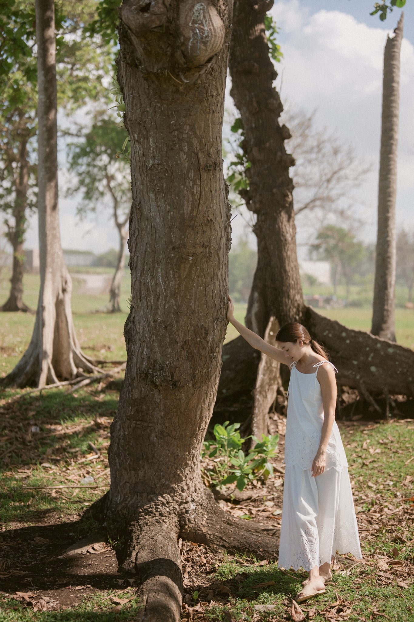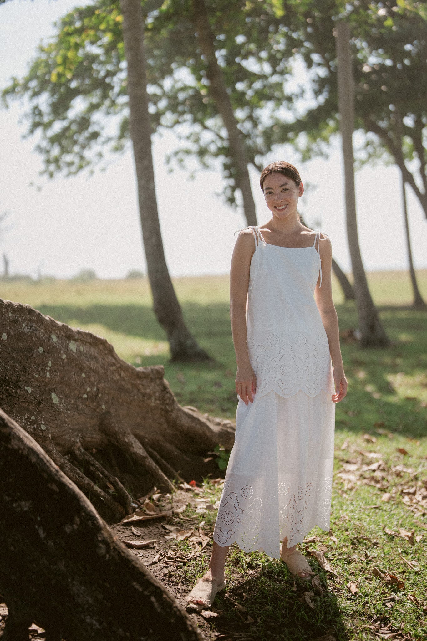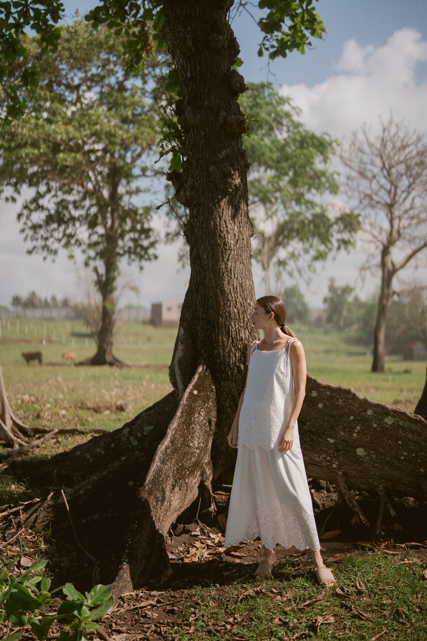 Light drifts through the trees, soft against the embroidered edge - the Embroidered Cotton Top carries the quiet charm of handwork and the ease of open air. Designed with tie straps and a clean, straight neckline, it falls gently with scalloped embroidery tracing the hem like sunlight on water.