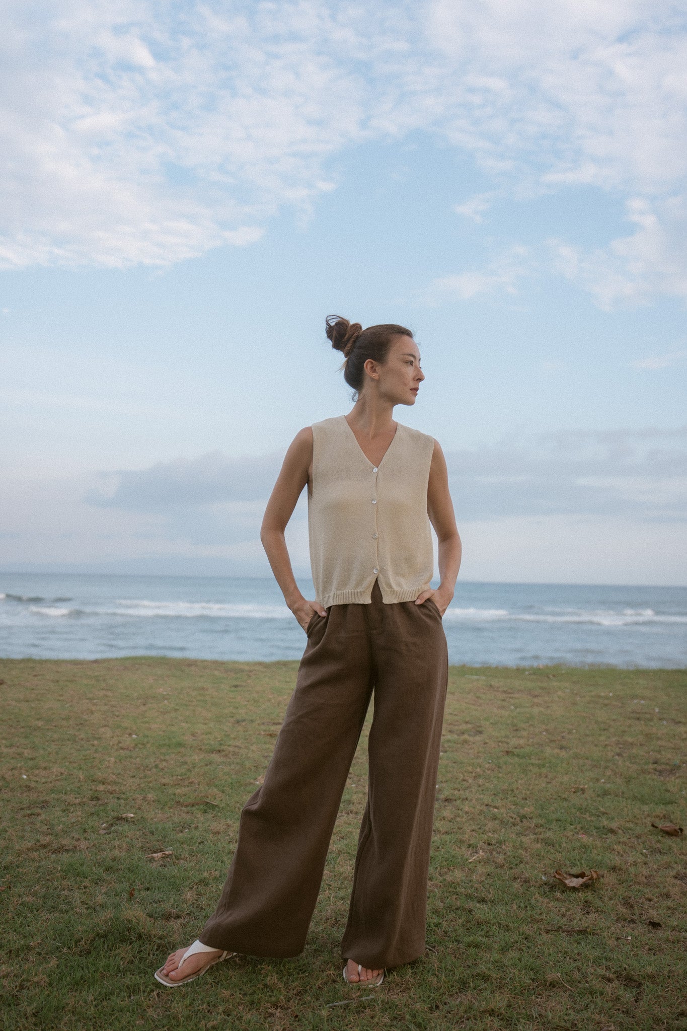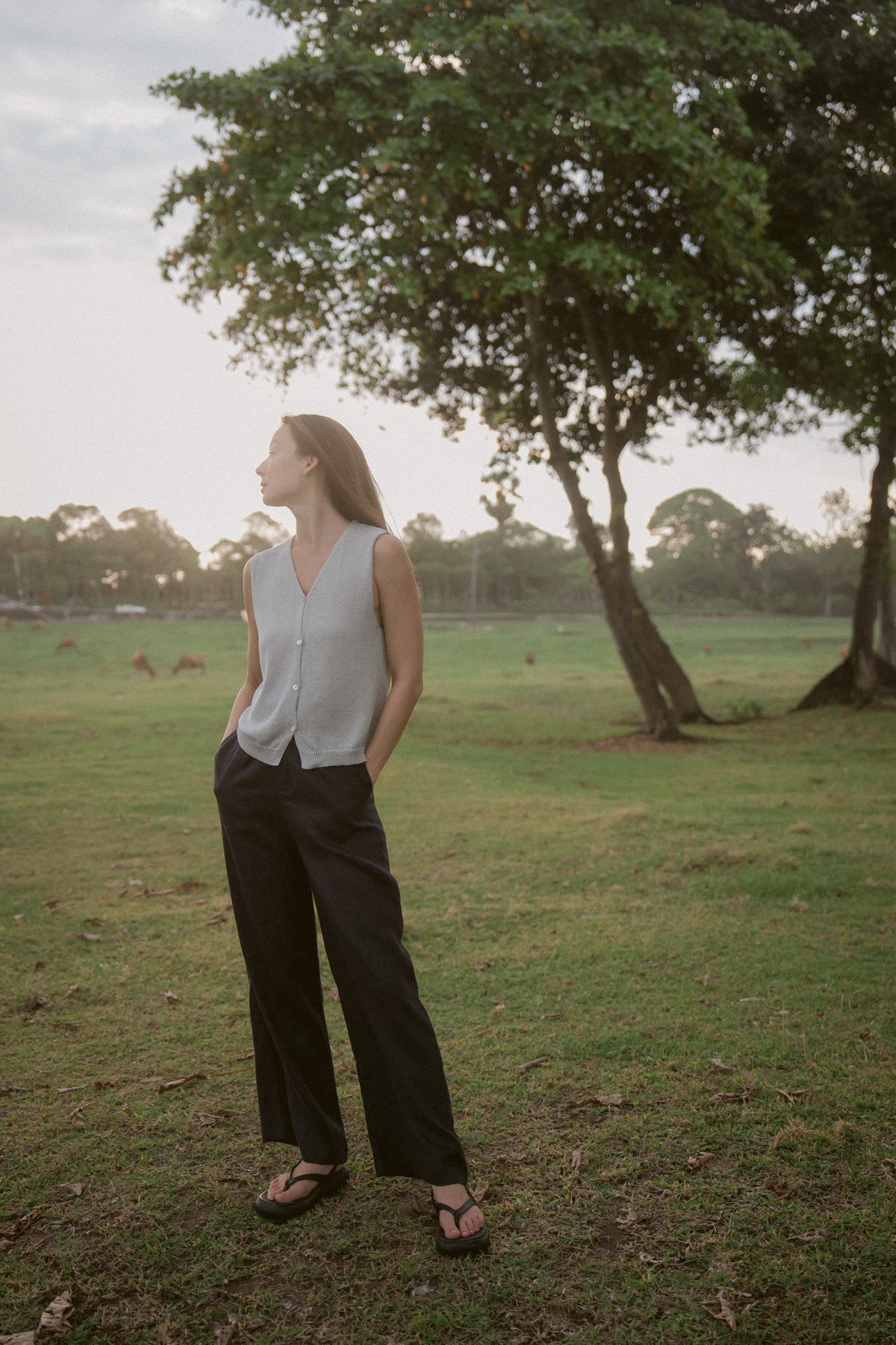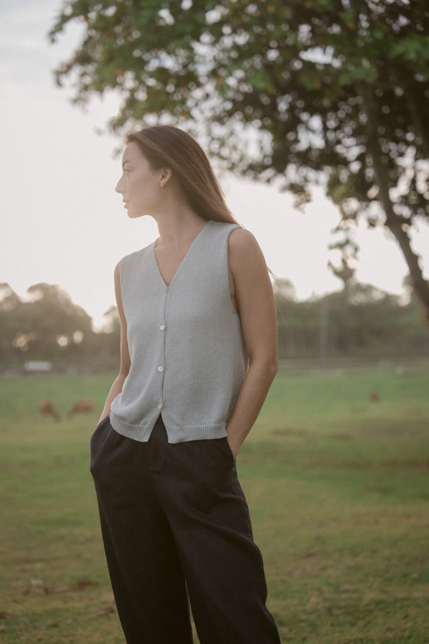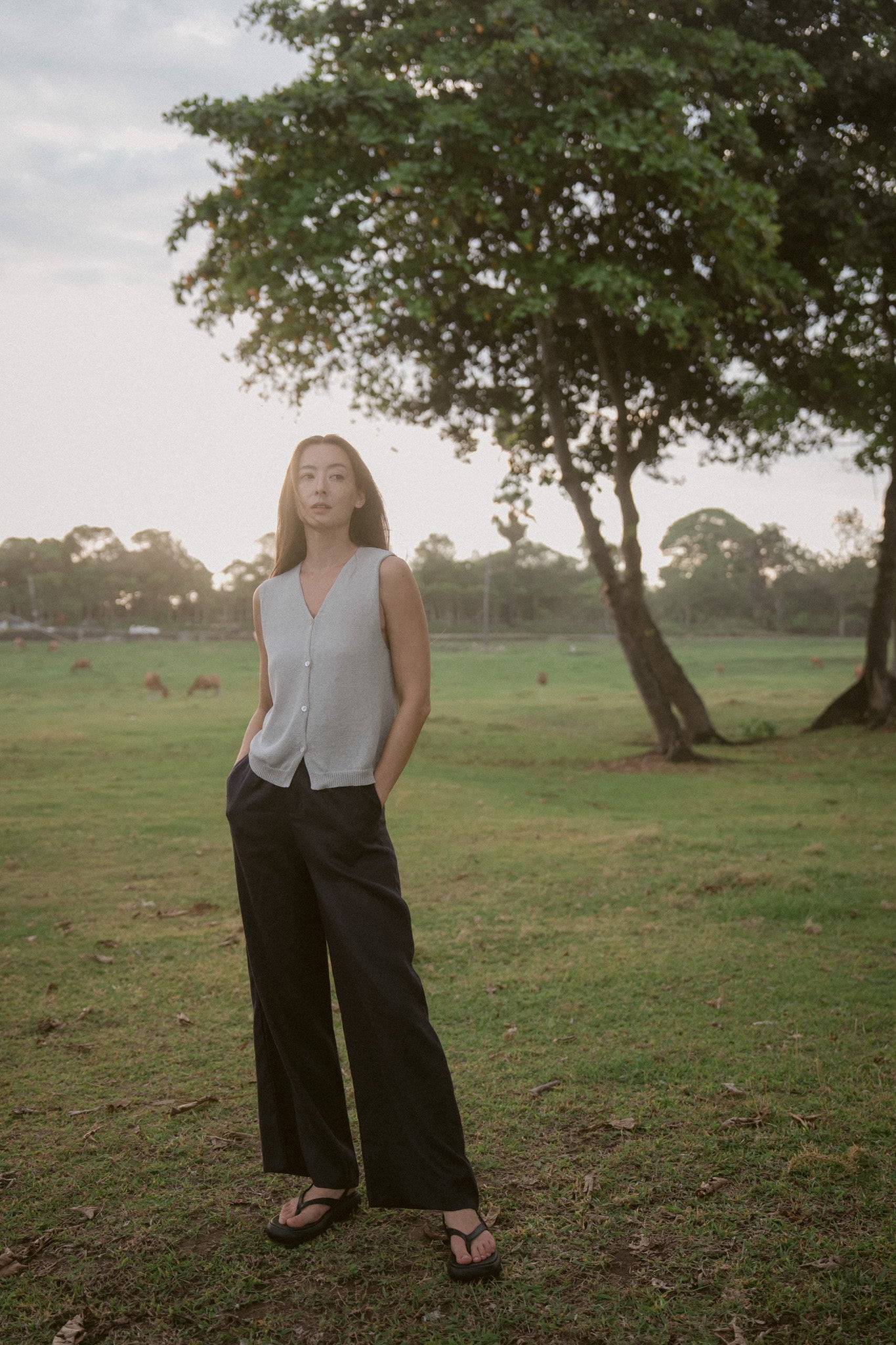 Soft light lingers on skin - the Strap Layer Top carries that same quiet ease. Designed with slender straps and a gentle double-layer hem, it brings movement to simplicity.