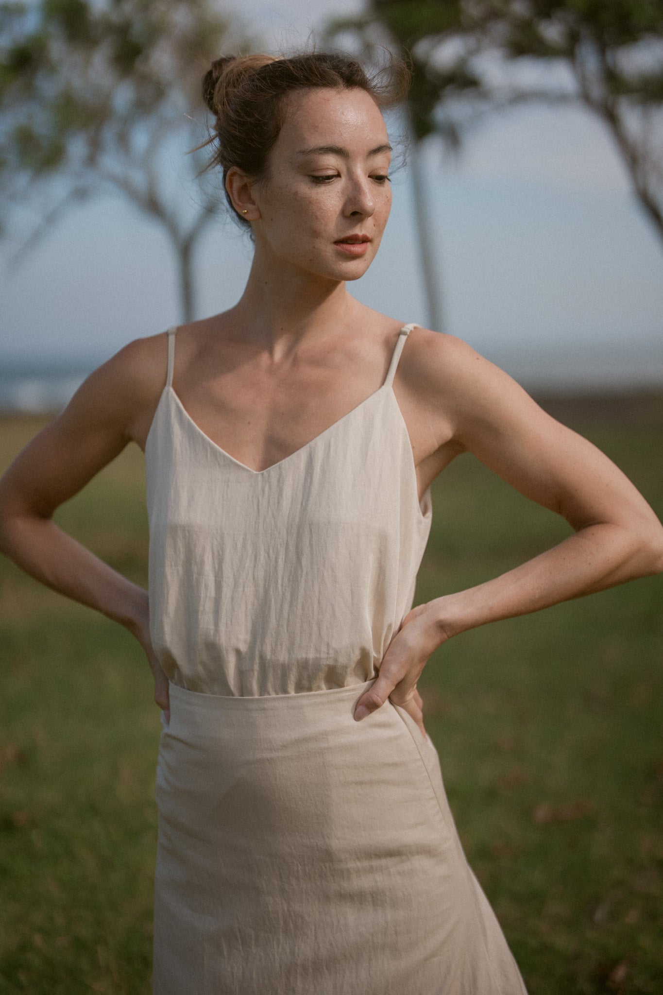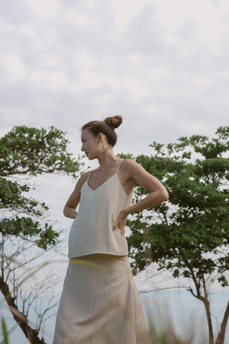 Crafted from a smooth Lyocell, Viscose & Nylon blend, the fabric holds a subtle sheen and weightless drape, cool against the skin and timeless in form. Pair it with the Nami Strap Top for a seamless expression of calm and balance.