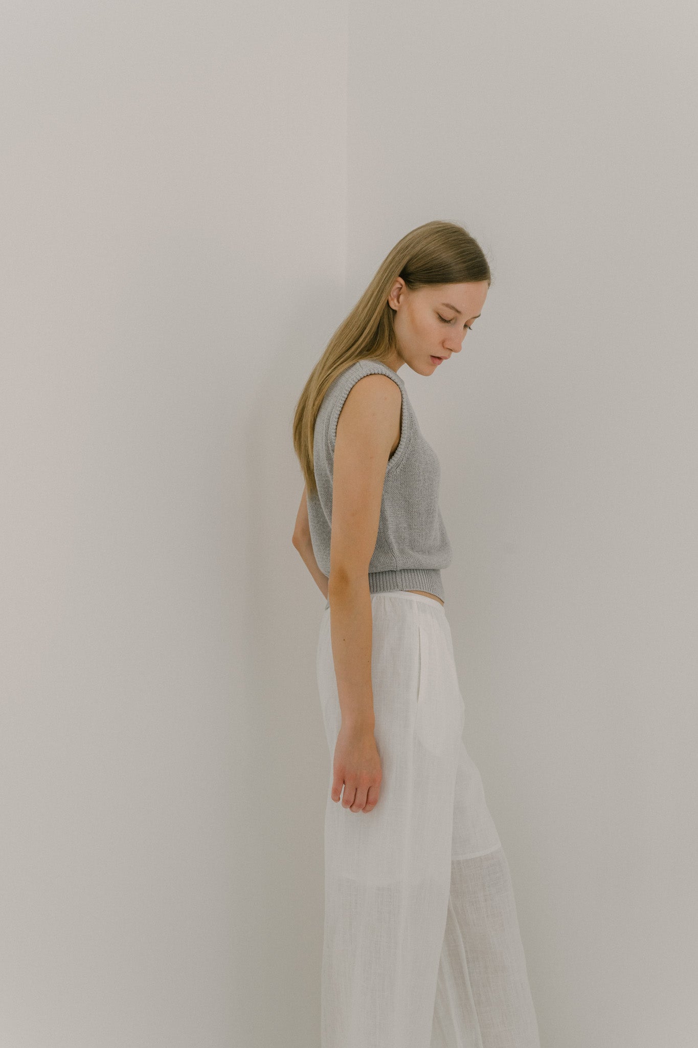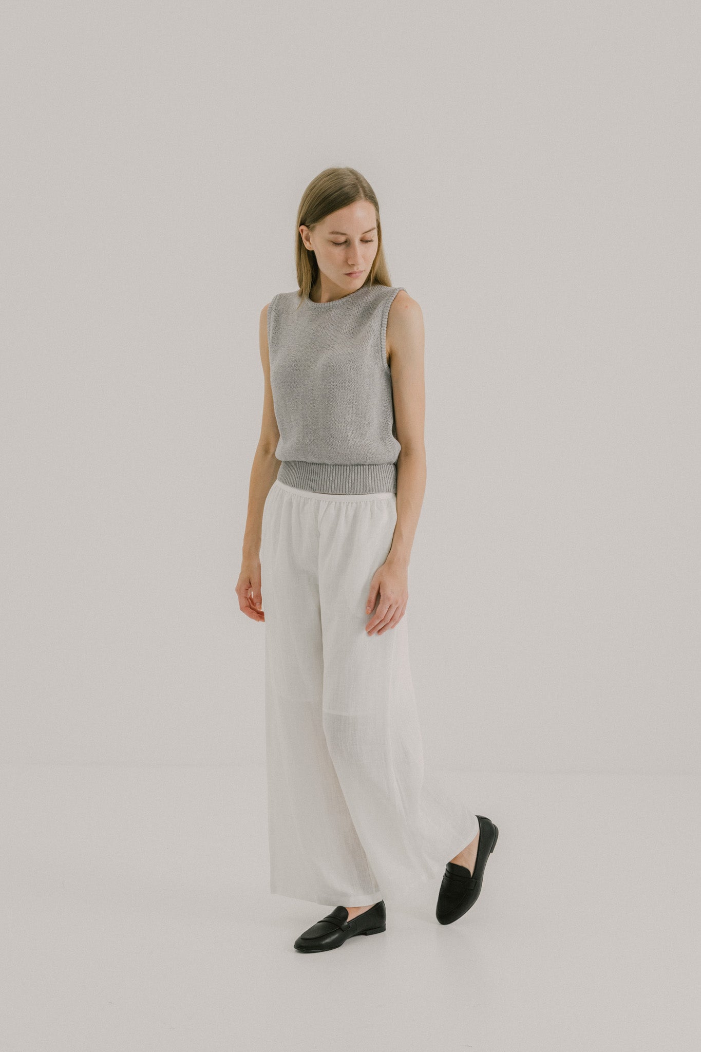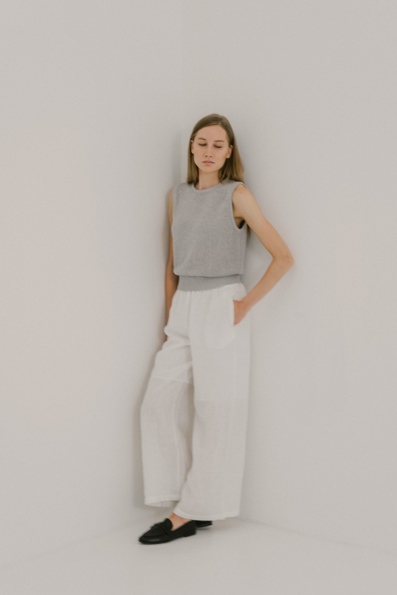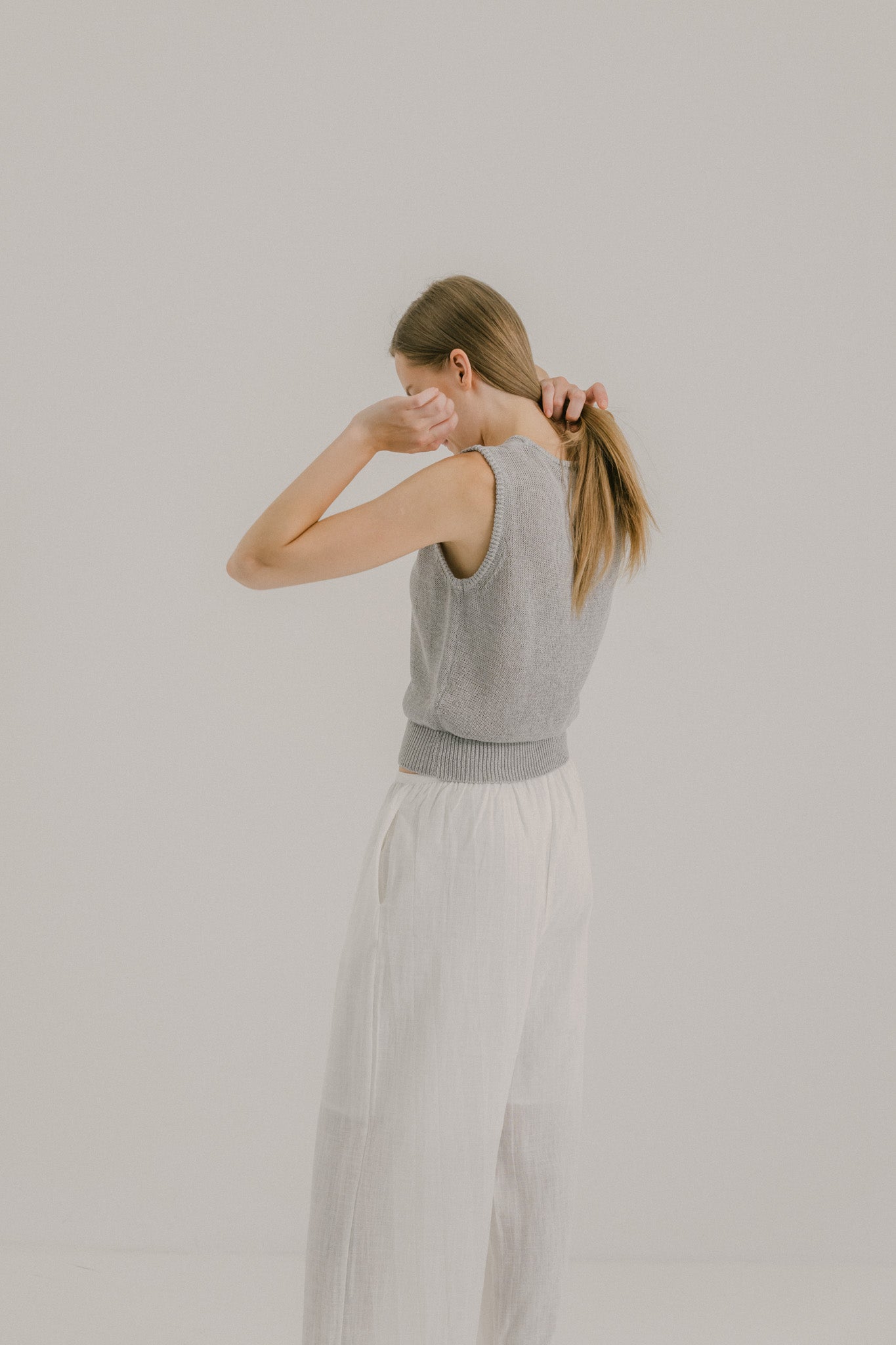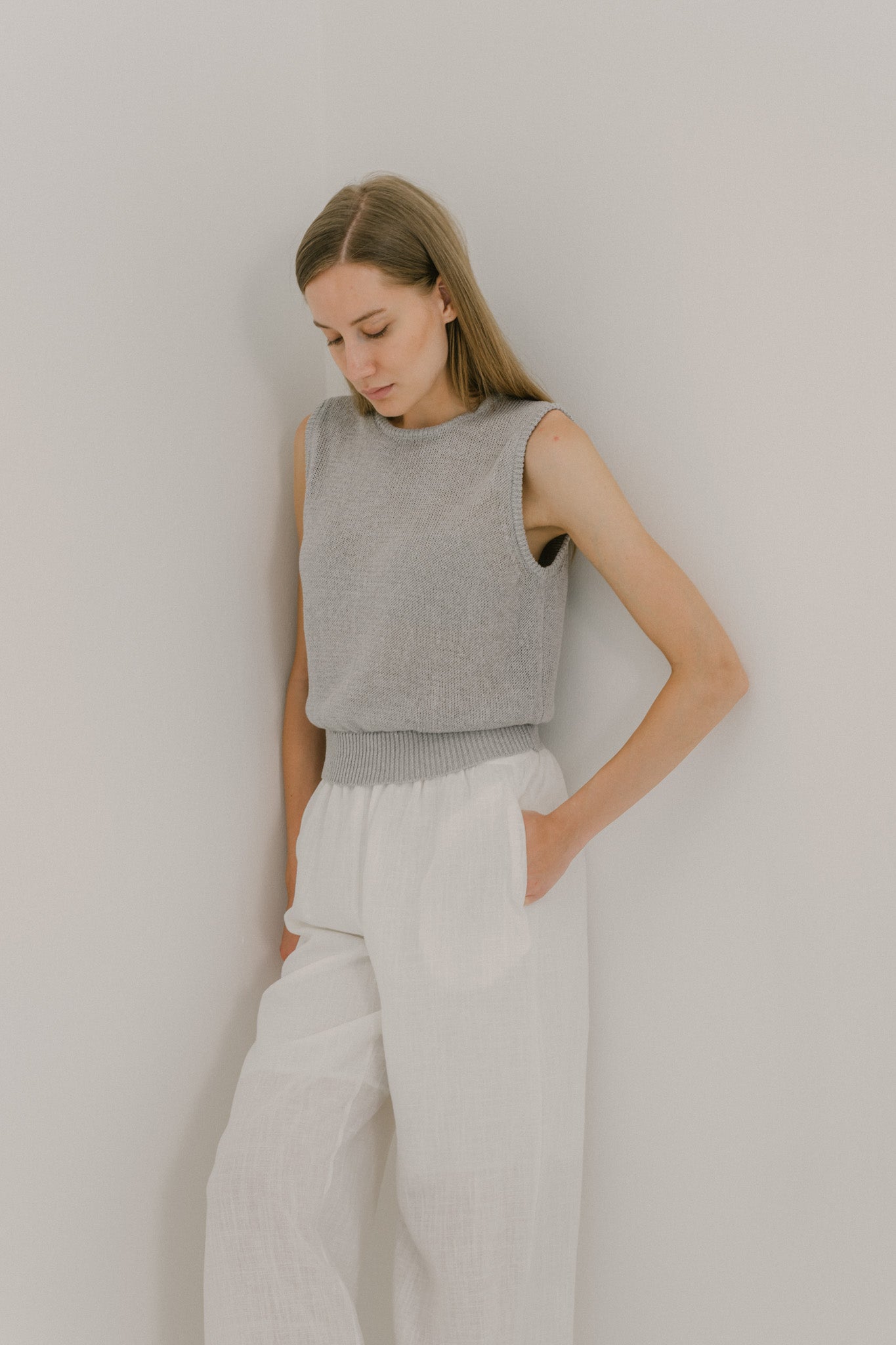 Lightweight yet structured, this sleeveless knit top carries a quiet confidence. The close-knit bodice gently skims the body, while the ribbed hem draws in at the waist for subtle shape. A versatile piece that pairs easily with flowing skirts, wide trousers, or denim, it brings an understated polish to warm-weather dressing.