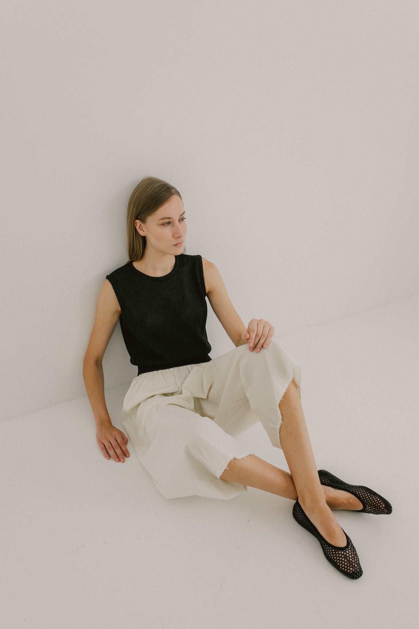 Lightweight yet structured, this sleeveless knit top carries a quiet confidence. The close-knit bodice gently skims the body, while the ribbed hem draws in at the waist for subtle shape. A versatile piece that pairs easily with flowing skirts, wide trousers, or denim, it brings an understated polish to warm-weather dressing.