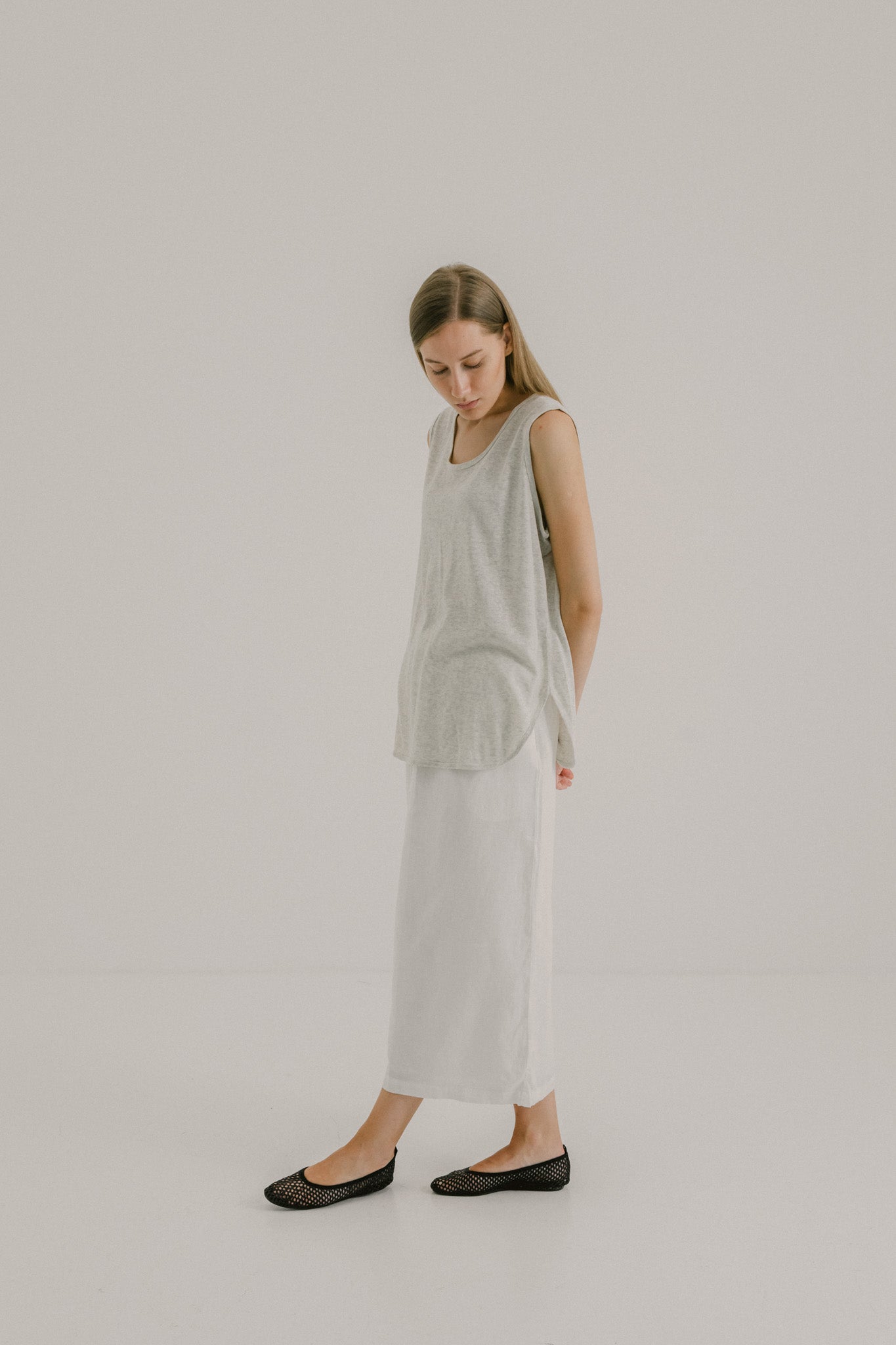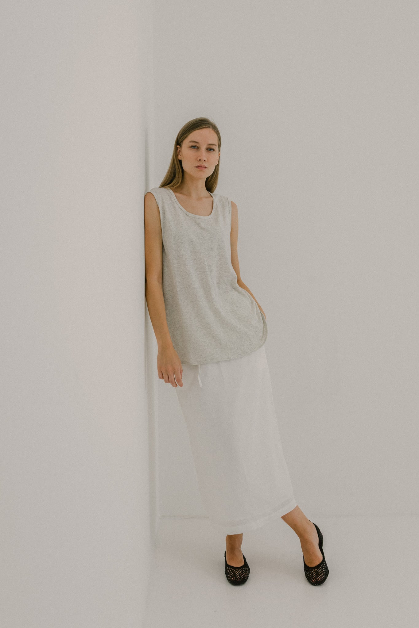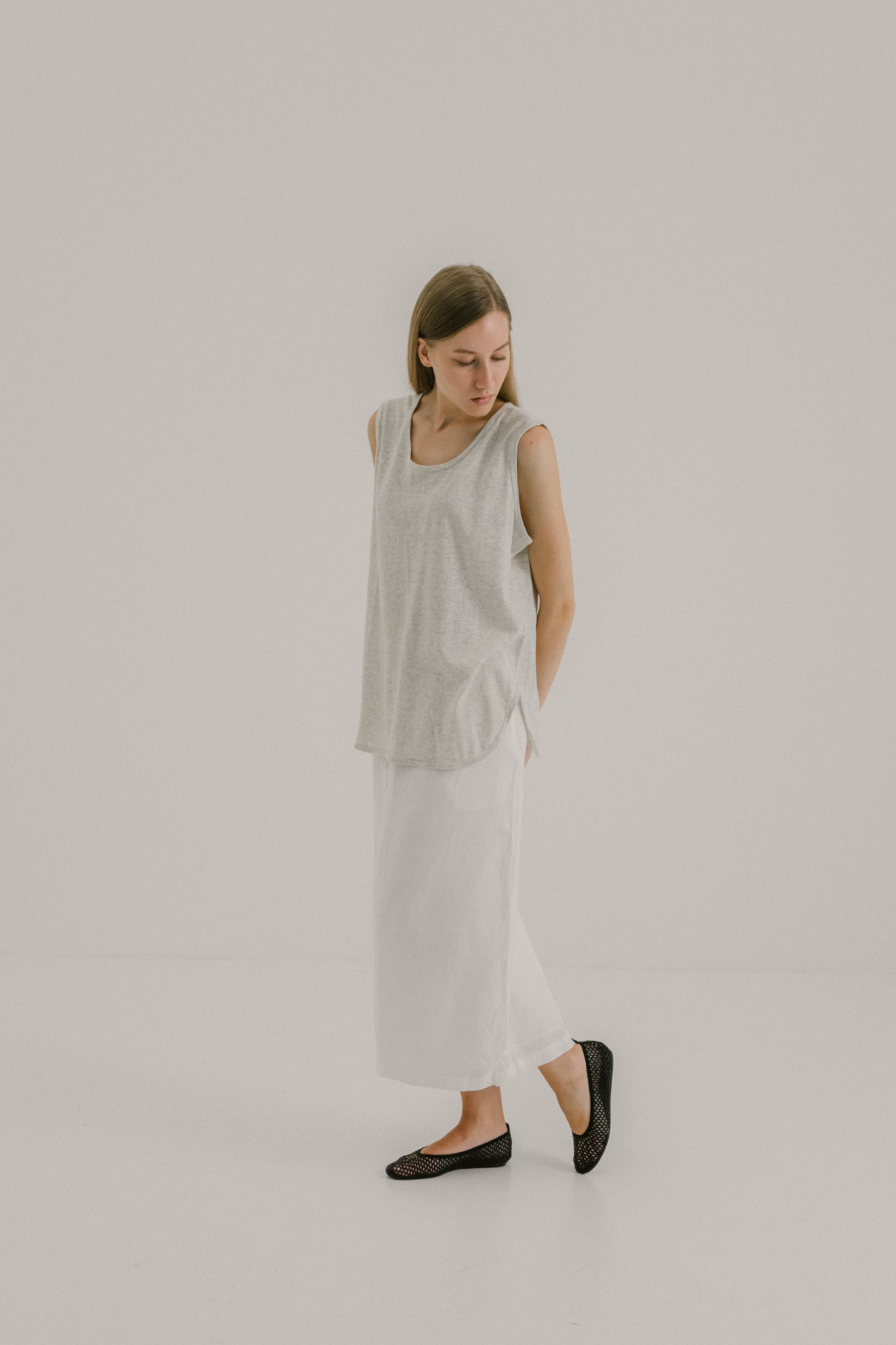 Soft and fluid, this viscose tank drapes with ease, falling gently against the body in a way that feels effortless. Its sleeveless cut and rounded neckline give it a clean, simple look, while the relaxed oversized fit and side slit hem keep it airy and easy to wear through the day.