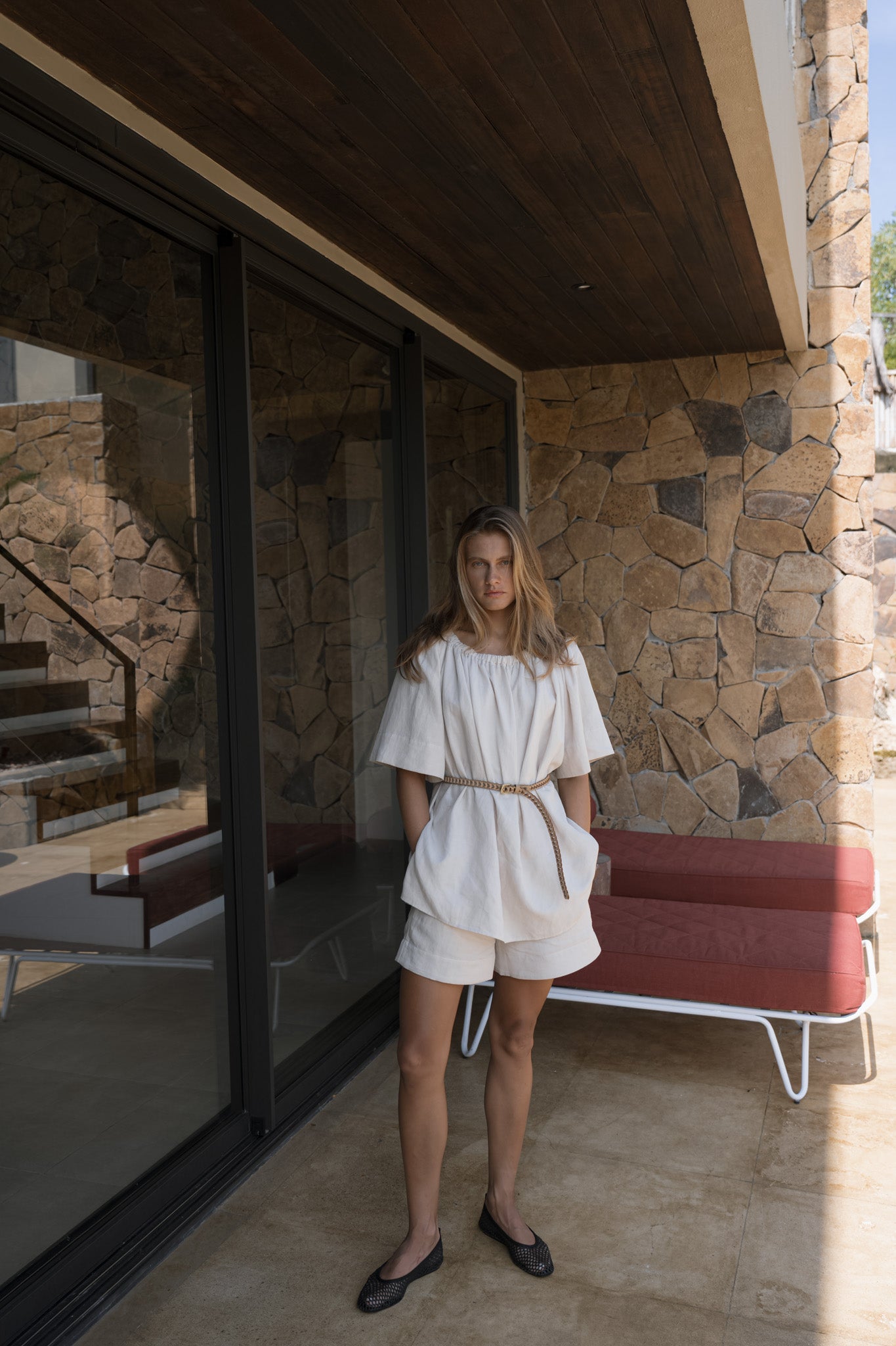A voluminous cotton top that captures an easy, sculptural silhouette. Designed with a gathered neckline and wide sleeves, it drapes effortlessly over the body for a sense of lightness and calm.