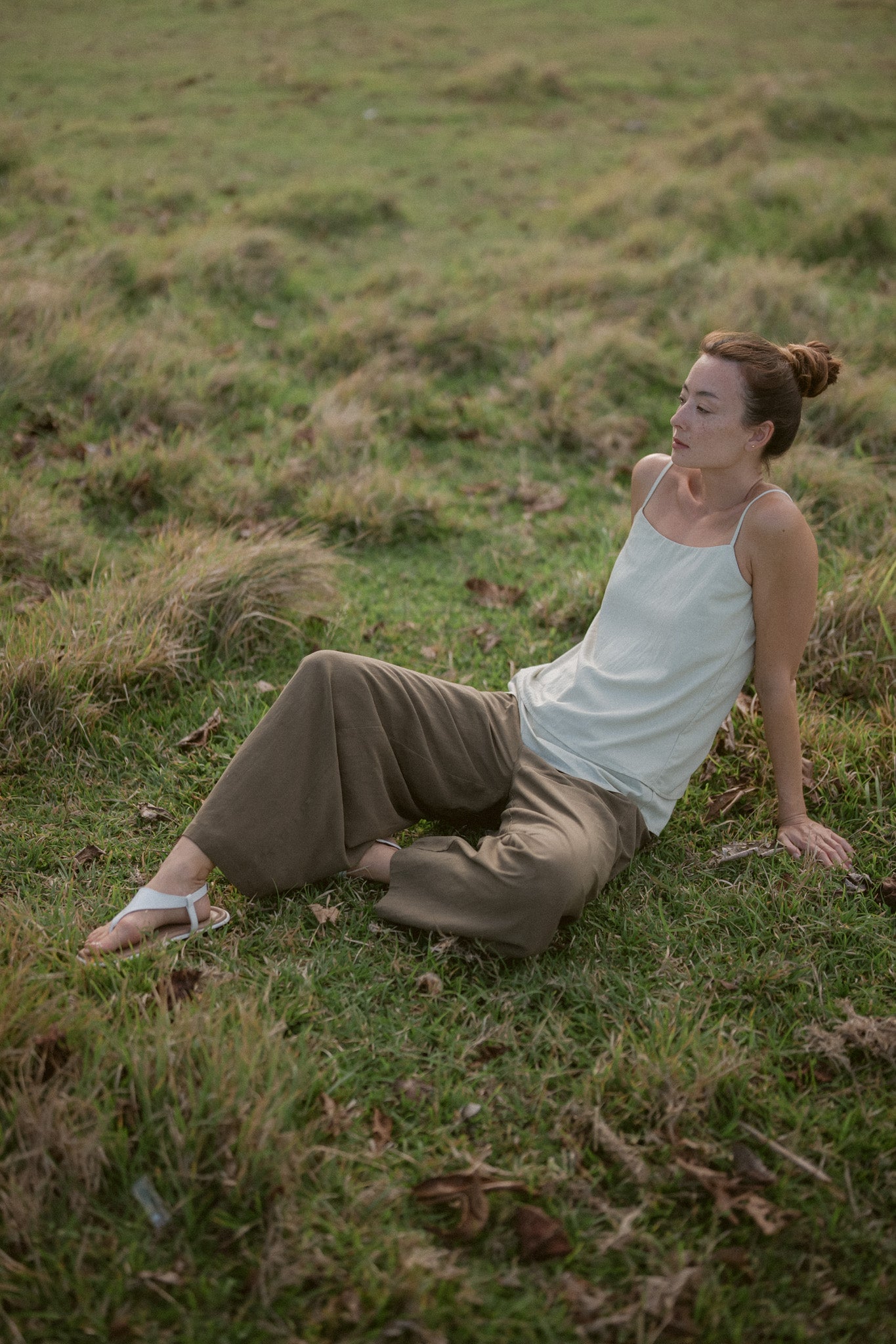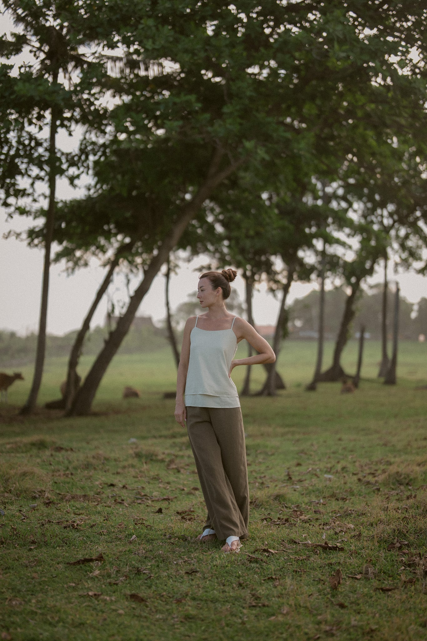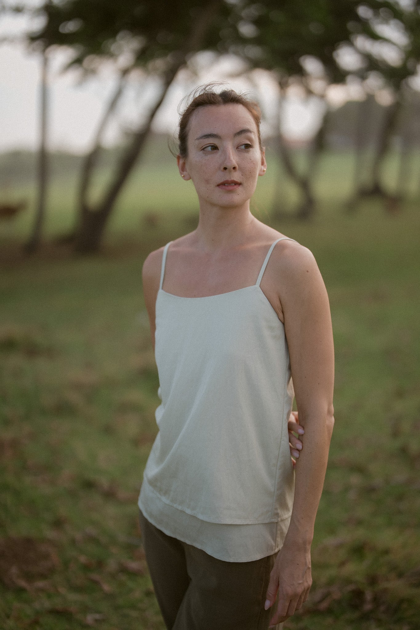 Soft light lingers on skin - the Strap Layer Top carries that same quiet ease. Designed with slender straps and a gentle double-layer hem, it brings movement to simplicity.