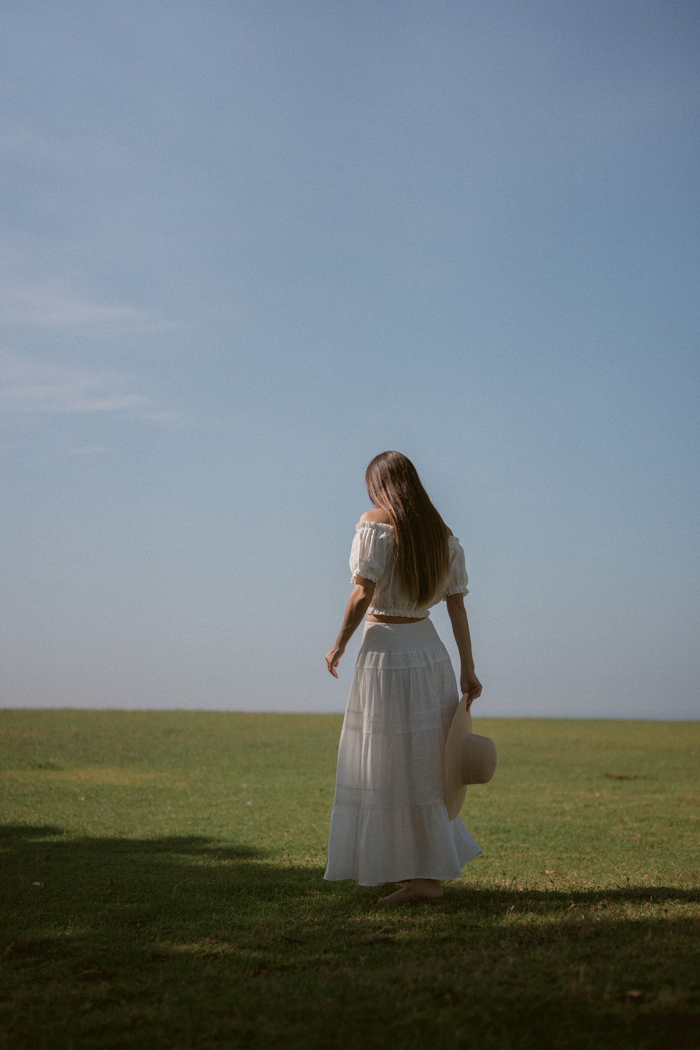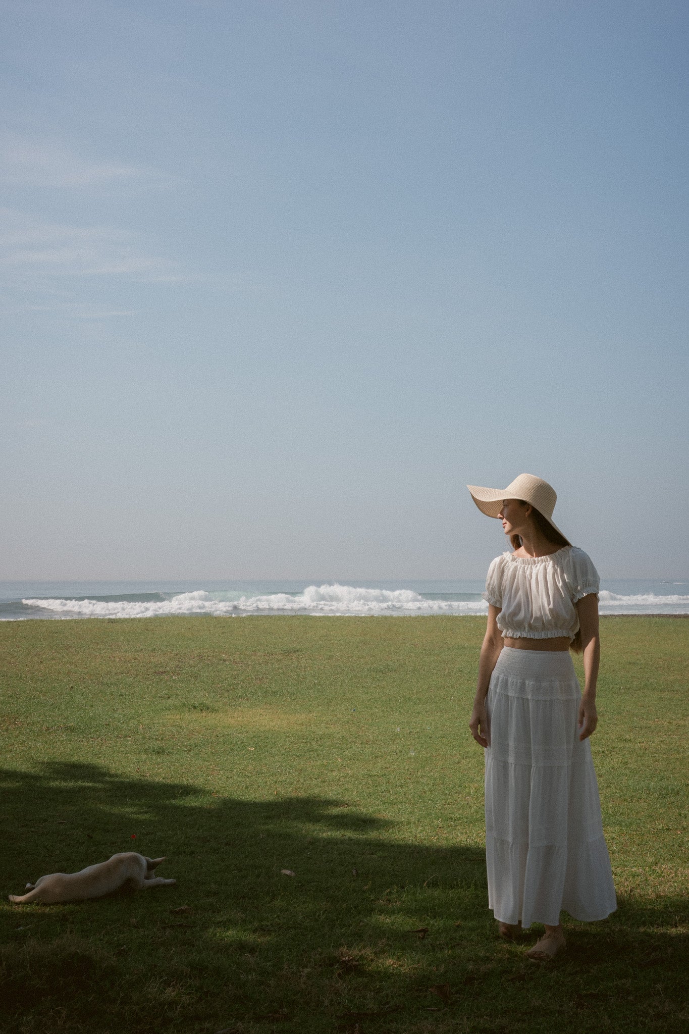 Light as the afternoon breeze and soft as sunlight on sand, the Suna Crop Top brings a sense of play and ease. Its off-shoulder silhouette, gathered hem, and delicate lace detailing evoke the calm rhythm of coastal days.