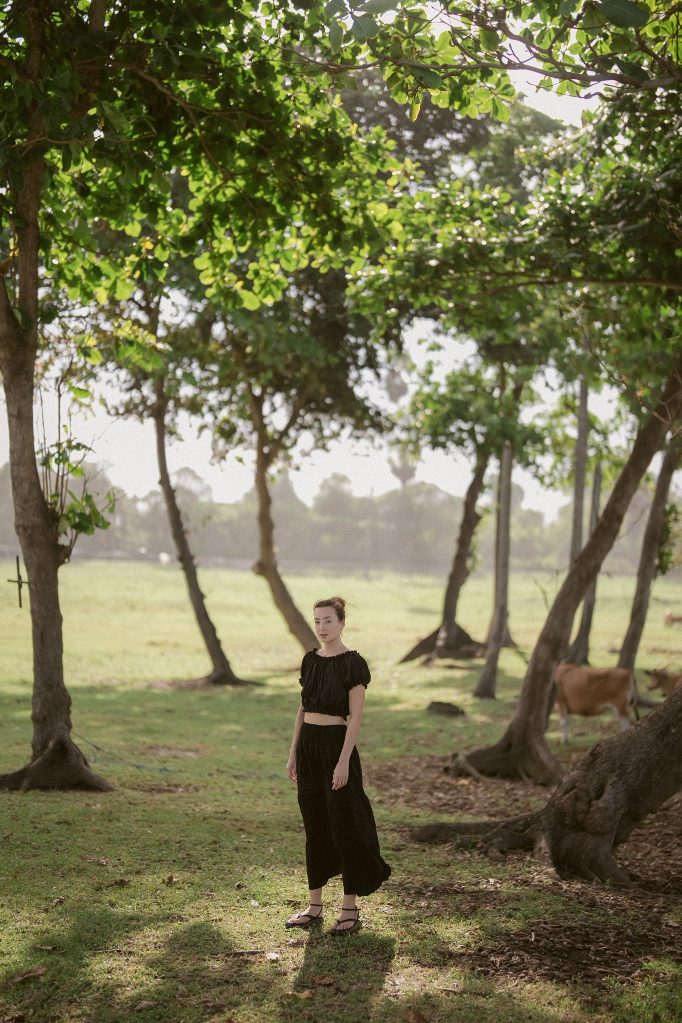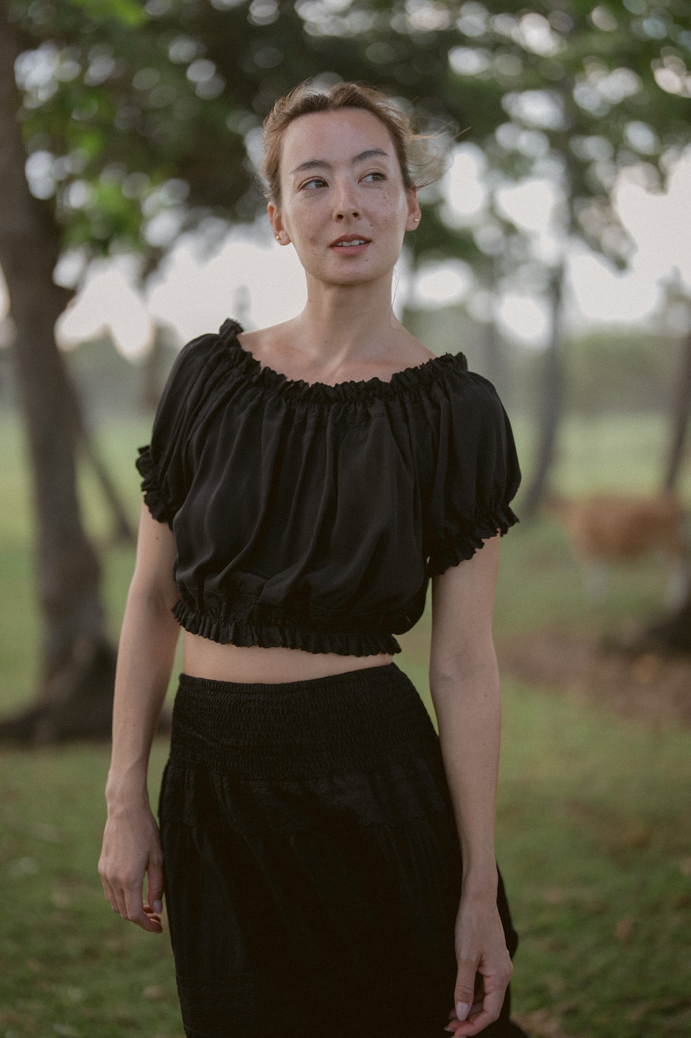 Light as the afternoon breeze and soft as sunlight on sand, the Suna Crop Top brings a sense of play and ease. Its off-shoulder silhouette, gathered hem, and delicate lace detailing evoke the calm rhythm of coastal days.